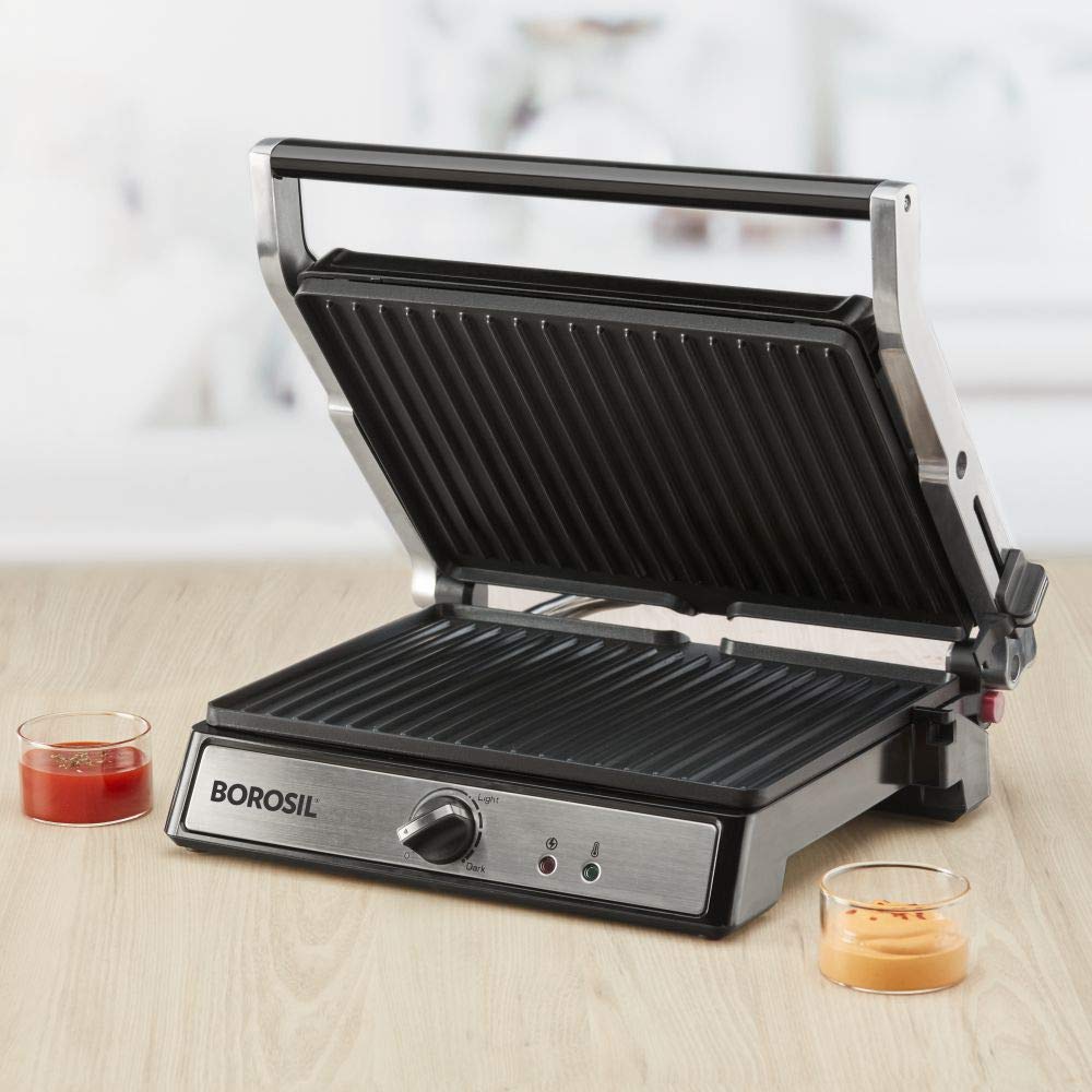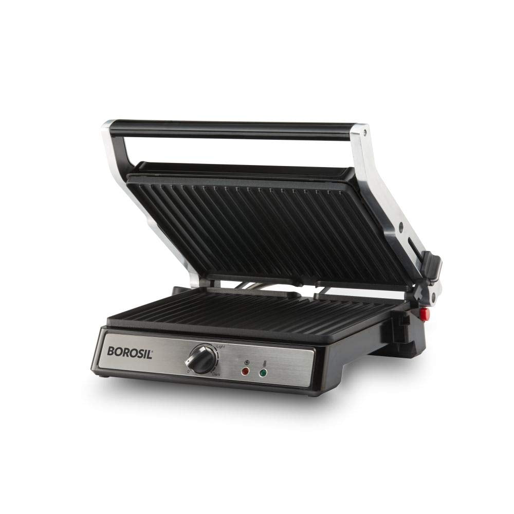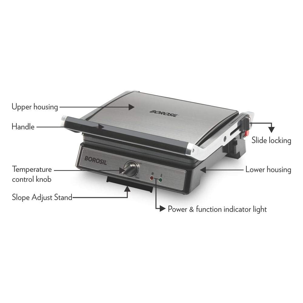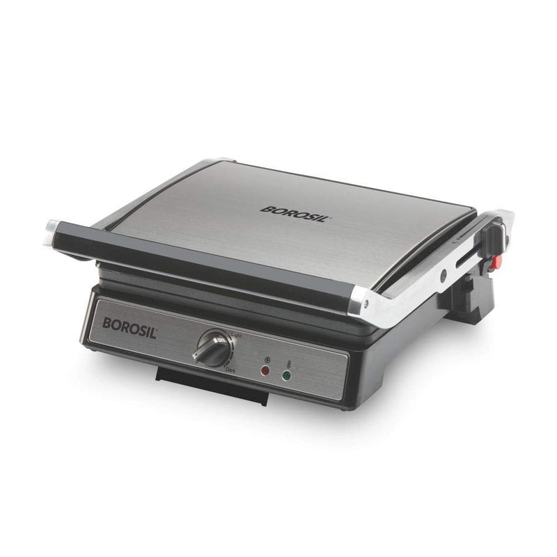 Borosil Super Jumbo 180° Grill Sandwich Maker, 2000W – 4-Slice, Non-Stick Plates, Oil Collector Tray (Silver/Black, BGRILLSS12)