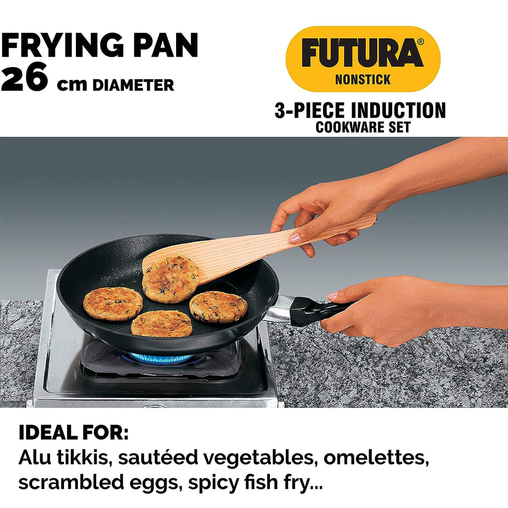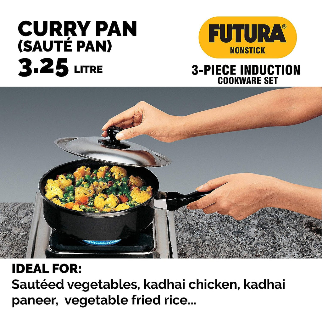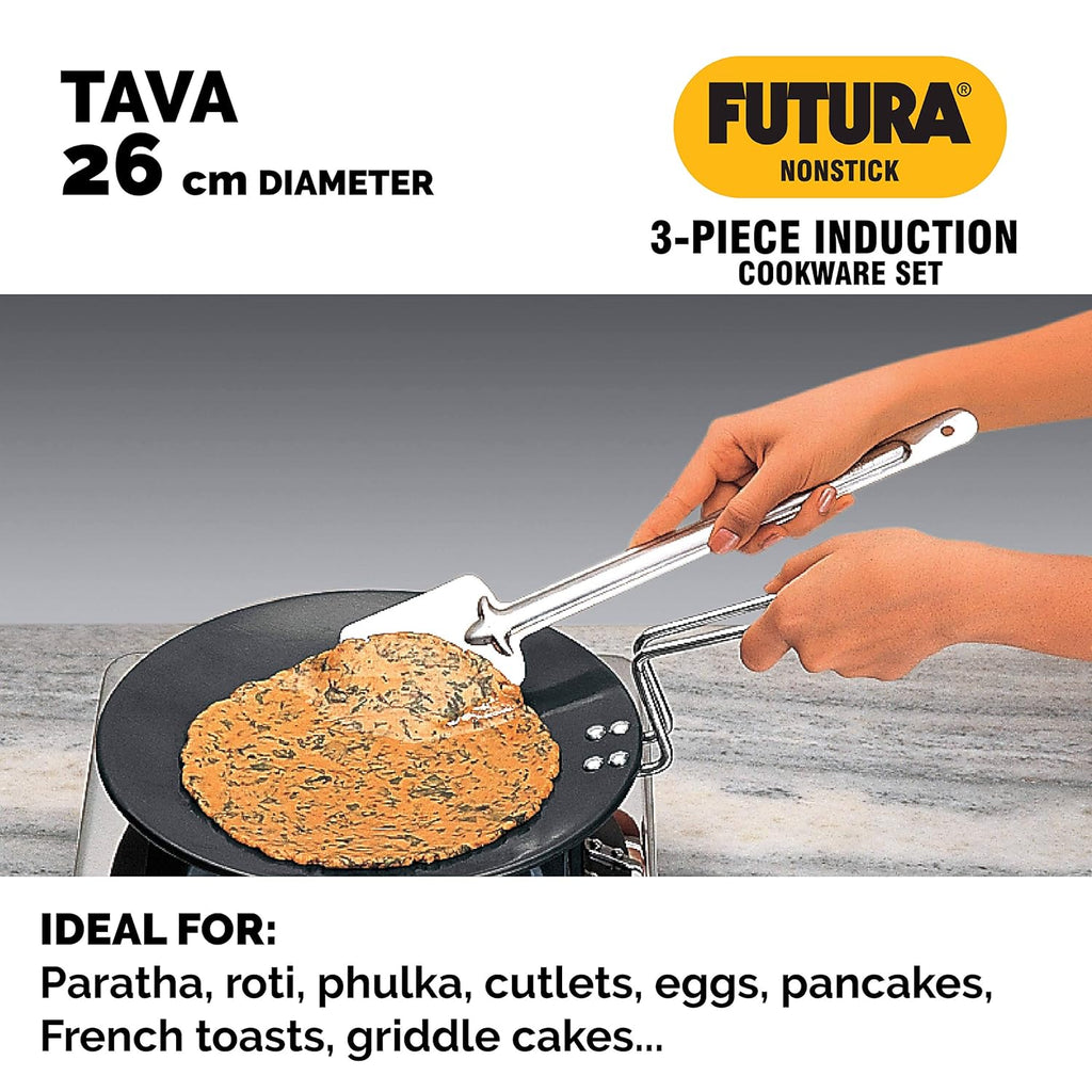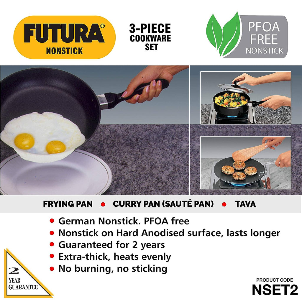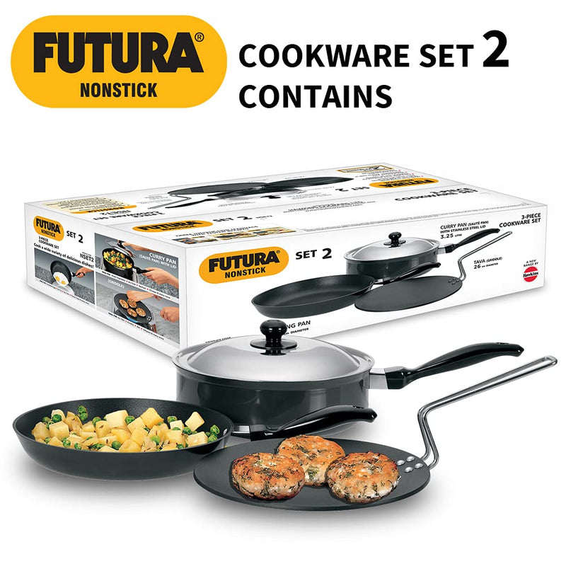 - The Cookware set consists of a Flat Tava, Frying Pan, and Curry Pan (Sauté Pan) with a Stainless steel lid to cater to most of your cooking needs