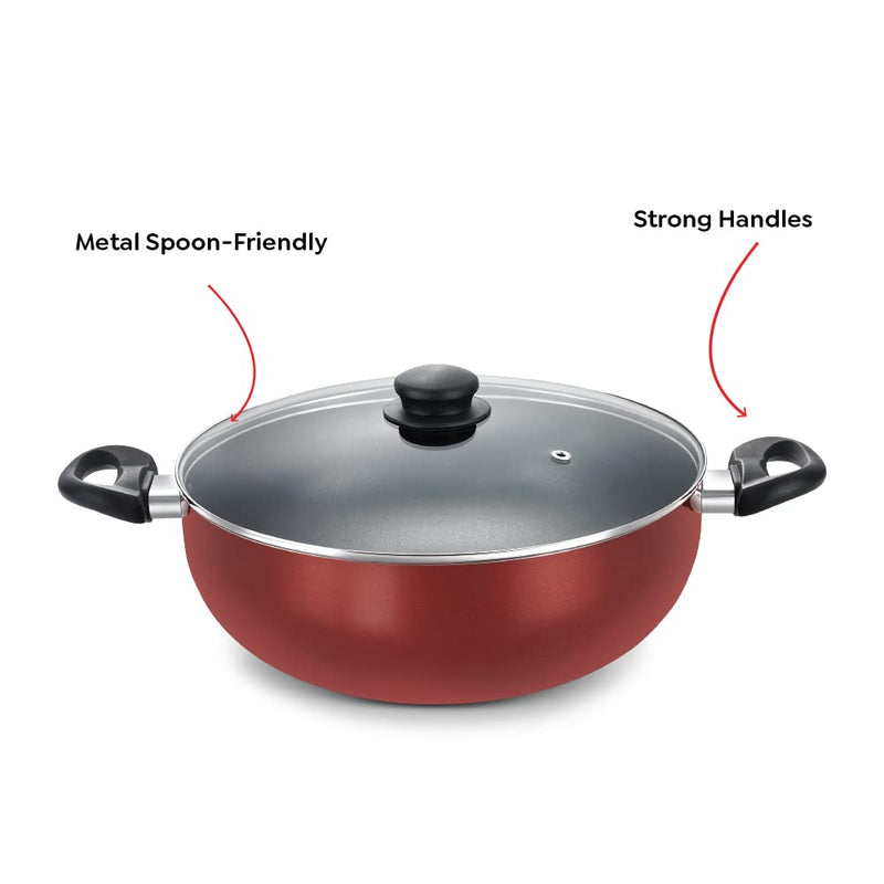 - METAL SPOON-FRIENDLY NON-STICK SURFACE: Deep Kadai has a metal spoon-friendly non-stick surface which gives longer life to the cookware. The superior quality non-stick surface consumes lesser oil while cooking the food.
