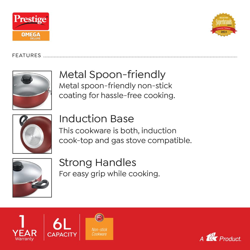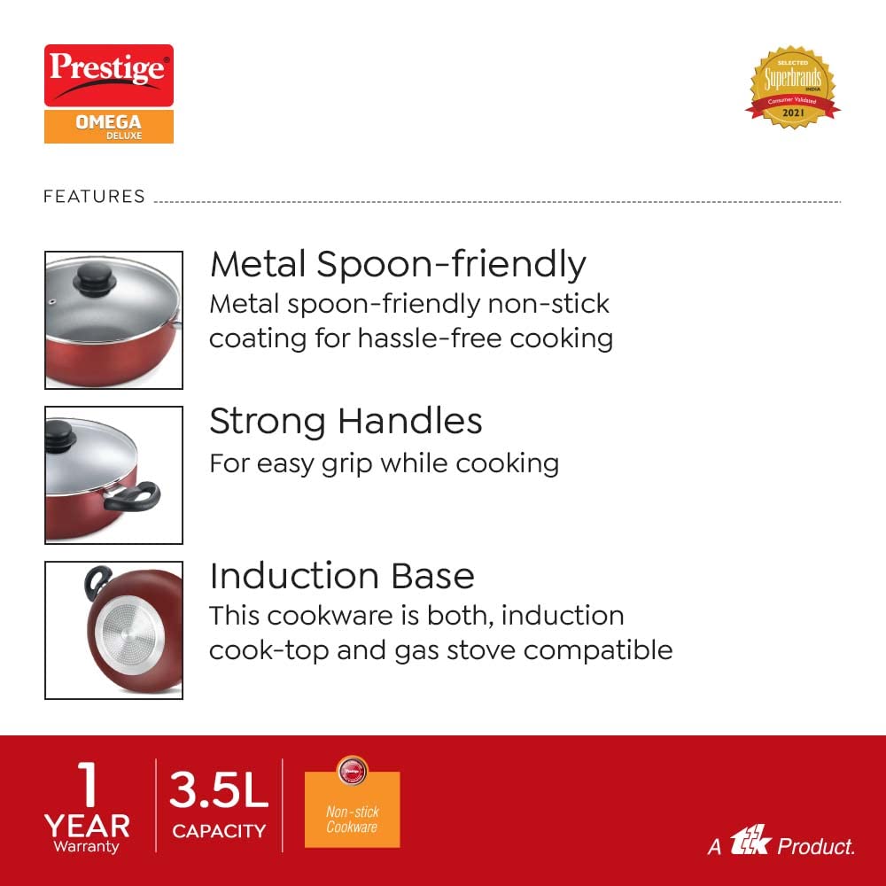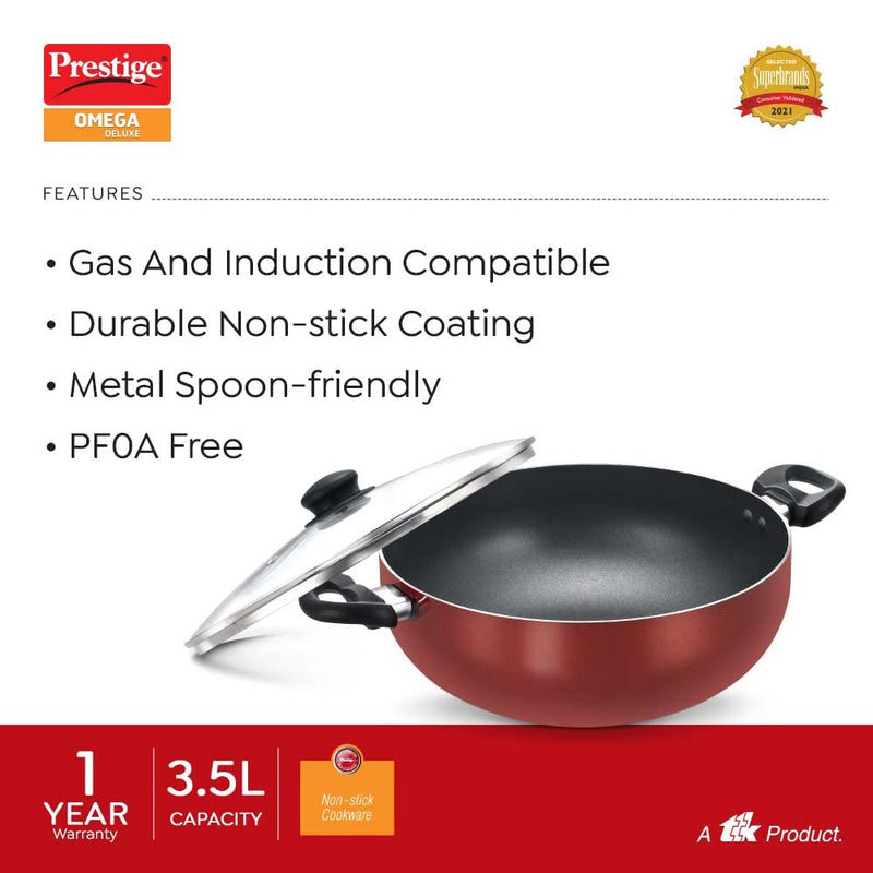 - The new and improved Prestige Omega Deluxe makes cooking safer and your food healthier. The Deep Kadai features a non-stick coating that ensures durability and poses no harm to your food. So, it's time to bring home a whole new cooking experience.