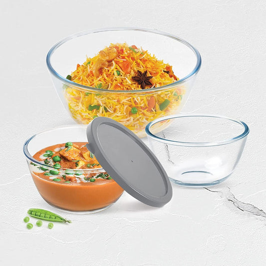 ट्रेओ ओवनसेफ मिक्सिंग बोरोसिलिकेट ग्लास बाउल त्वरित ढक्कन के साथ | पारदर्शी | 1 पीसी