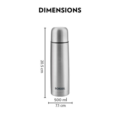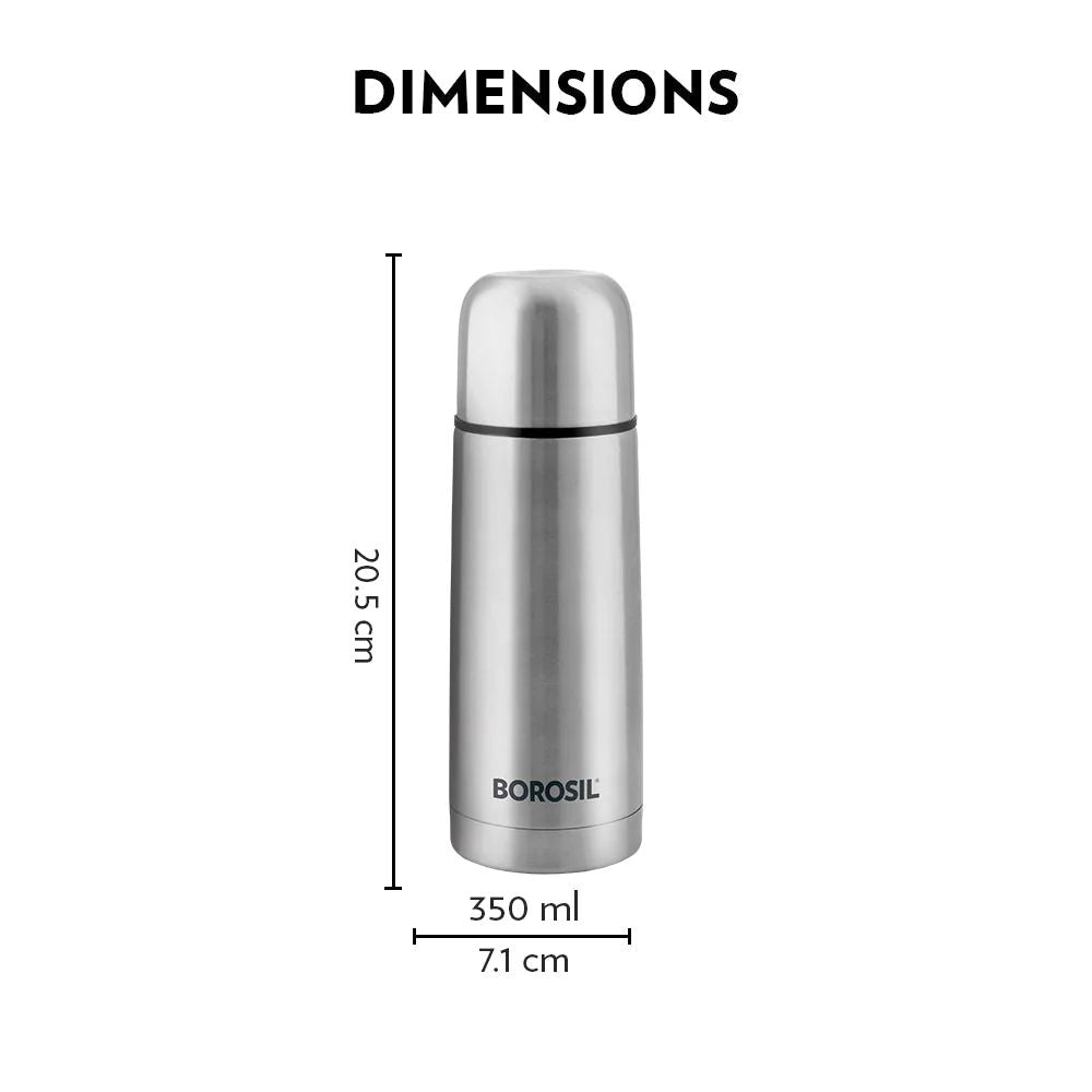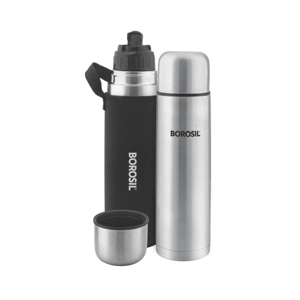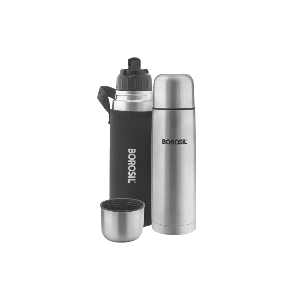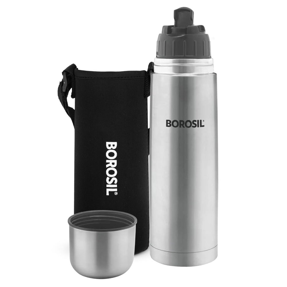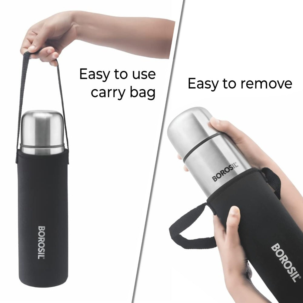 बोरोसिल स्टेनलेस स्टील हाइड्रा थर्मो वैक्यूम इंसुलेटेड फ्लास्क | चांदी और काला | 1 पीसी