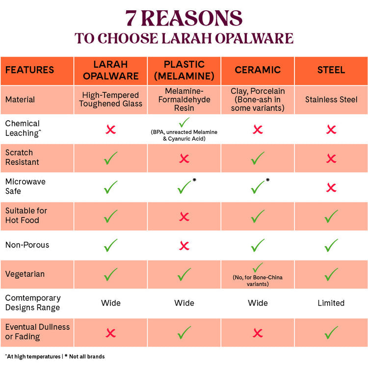• STAIN-RESISTANT & DISHWASHER-SAFE: Experience effortless cleaning with the Larah opalware dinner set. Designed to be stain-resistant, these sets ensure that no remnants of your last meal linger in the form of stains or smells. They are dishwasher-safe. Upgrade your dining experience with Larah by Borosil and enjoy hassle-free maintenance. Make every meal a delightful and pristine affair.