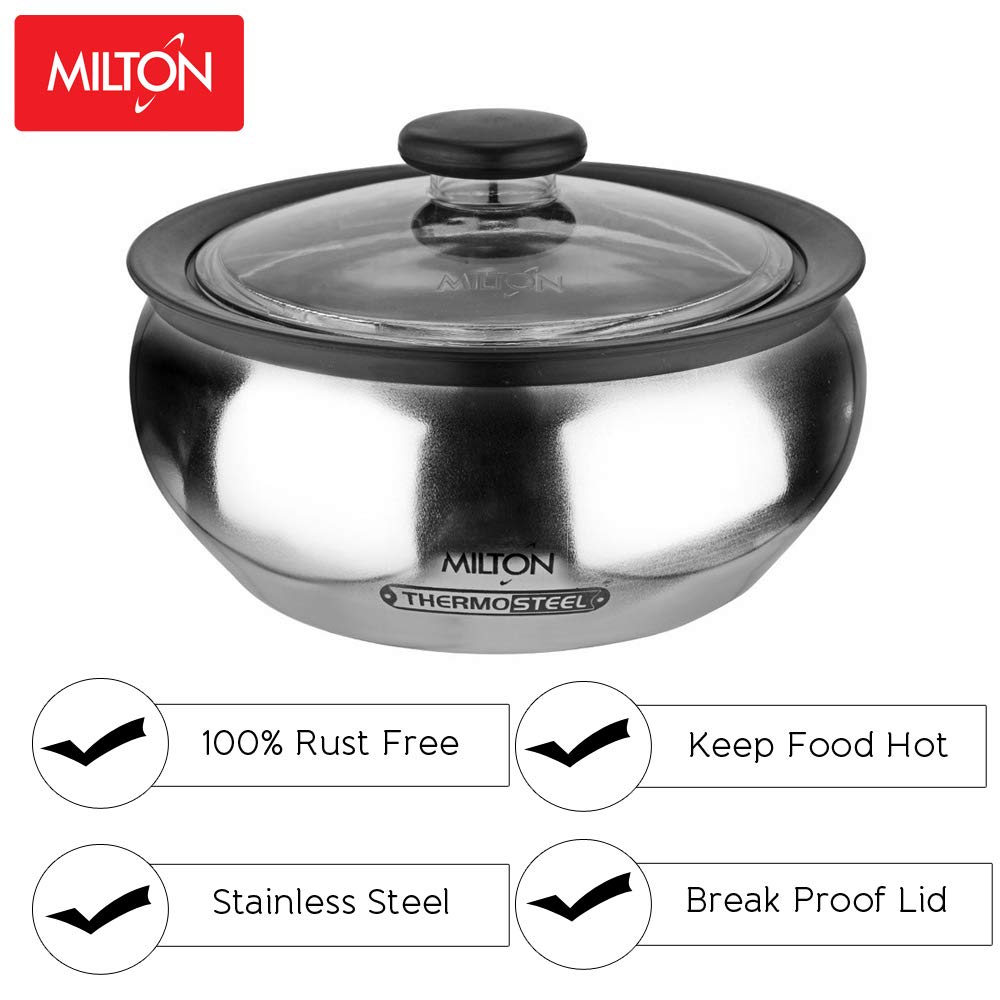 - इंसुलेटेड स्टील कैसरोल जो भोजन को लंबे समय तक गर्म रखता है