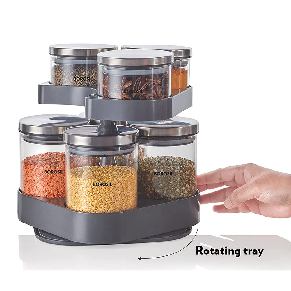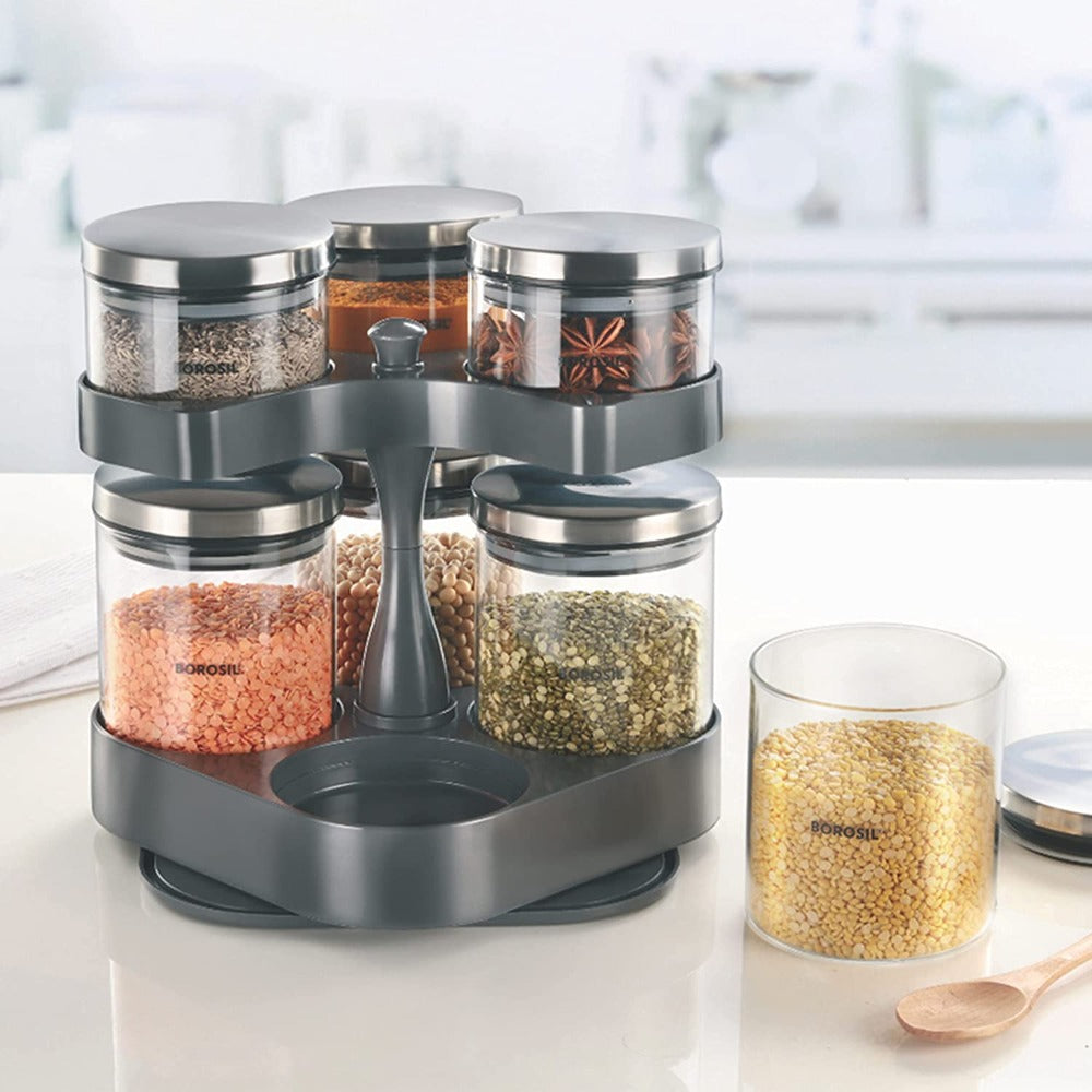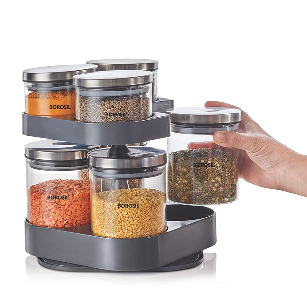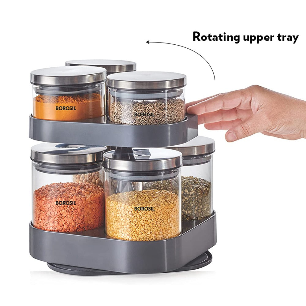 7 क्लासिक ग्लास जारसह बोरोसिल स्पिन एन स्टोअर ट्रे | पारदर्शक | 8 पीसीचा संच