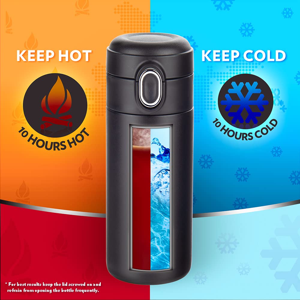 • 10 तास गरम आणि थंड: तुमचे पेय 10 तास थंड किंवा गरम ठेवते. आमच्या बीपीए-मुक्त पाण्याच्या बाटल्यांसह निरोगी चुंबन घ्या, जे गैर-विषारी पदार्थांनी बनवल्या जातात. आमच्या पुन्हा वापरता येण्याजोग्या पाण्याच्या बाटलीमुळे, दिवसभर हायड्रेट राहणे सोपे झाले आहे. सर्वात थंड पेयासाठी, तुमच्या इन्सुलेटेड बाटलीमध्ये बर्फाचे तुकडे घाला.