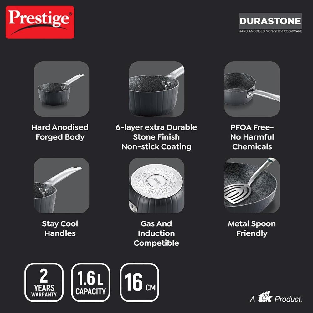 Prestige Durastone Hard Anodised 6 लेयर नॉन-स्टिक कोटिंग 16 CM काचेचे झाकण असलेले चहाचे पॅन | 1.6 लिटर | गॅस आणि इंडक्शन सुसंगत | काळा
