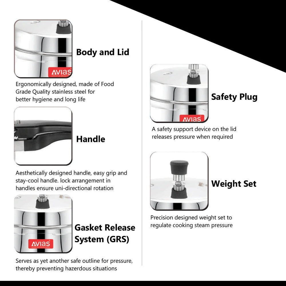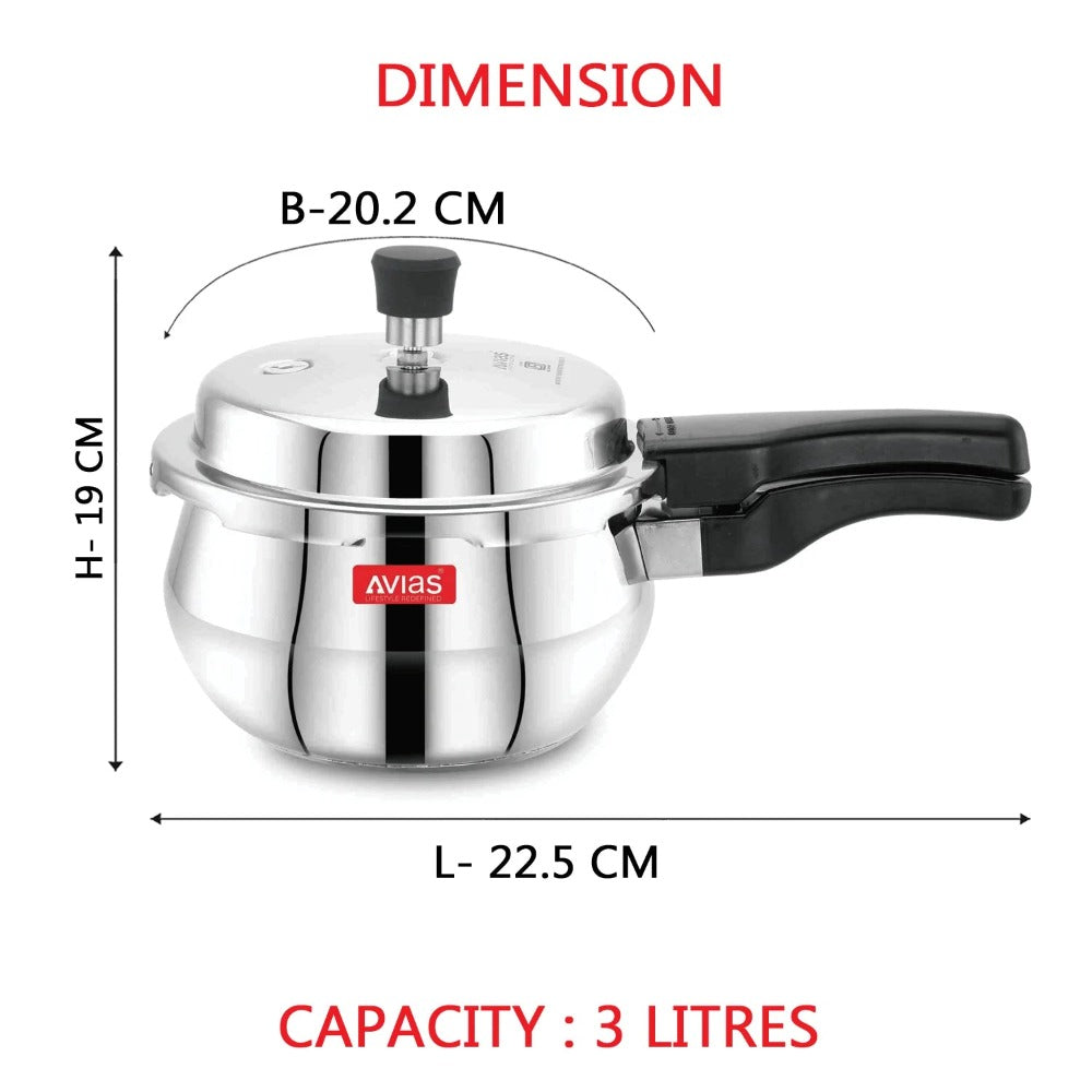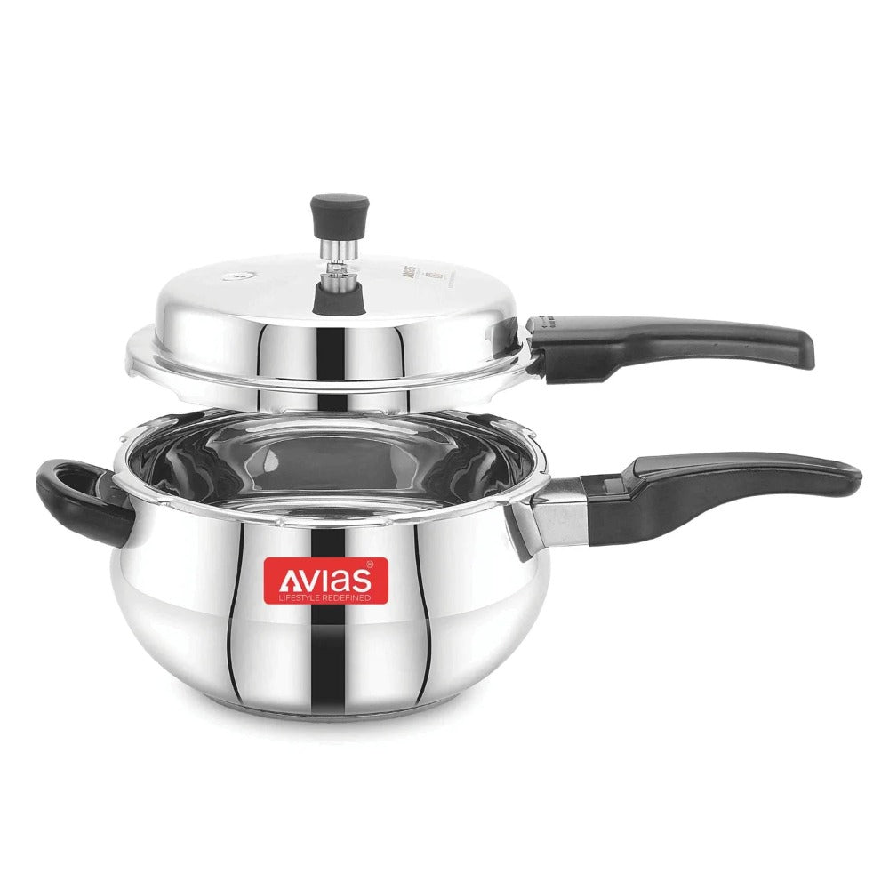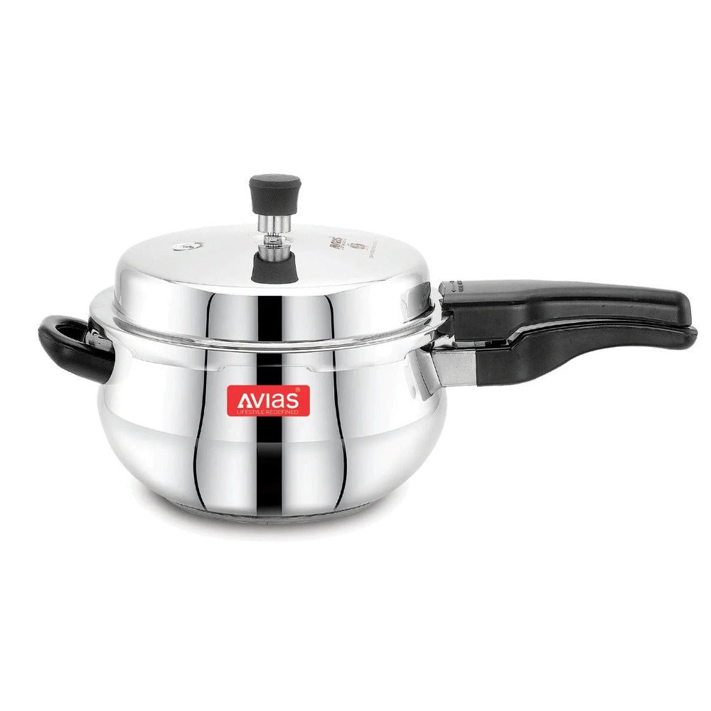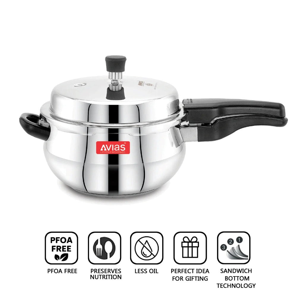 • The Avias Handi pressure cooker is a thick bottom stainless steel cookware always has the components you need for the ideal kitchen.