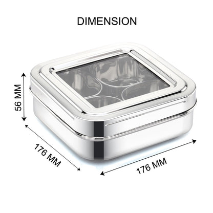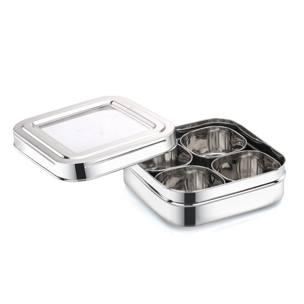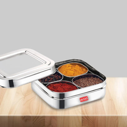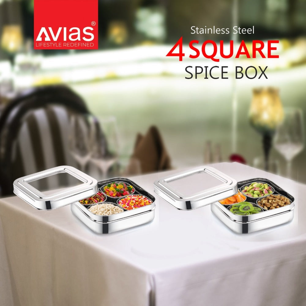 - Avias Spice box with square containers is a multifunctional container that can be used for storing spices, dry fruits, or mouth fresheners.