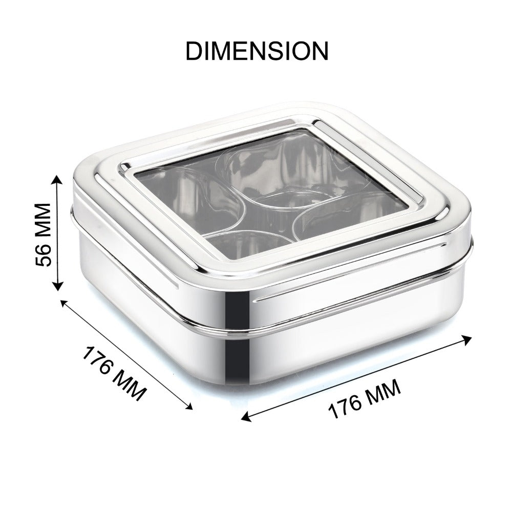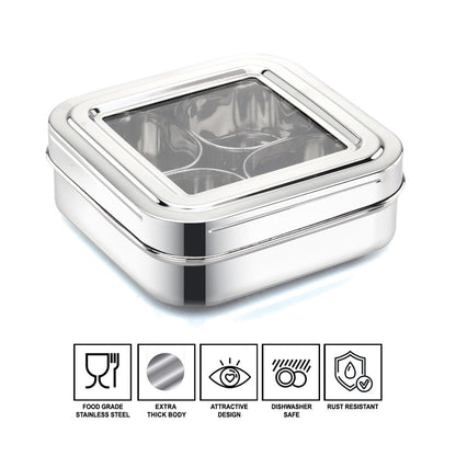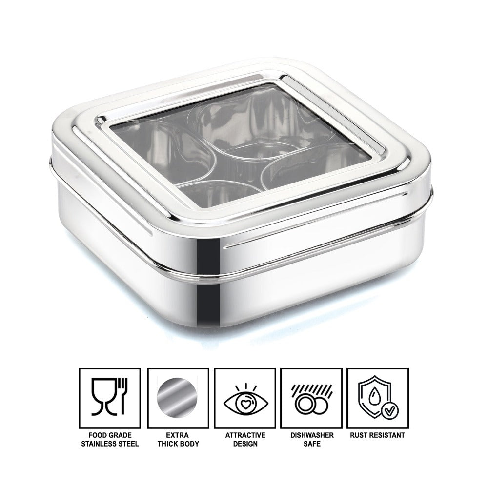 AVIAS Square Stainless Steel Spice Box with See-Through Glass Lid | 4 Compartments and 1 Spoon | Silver