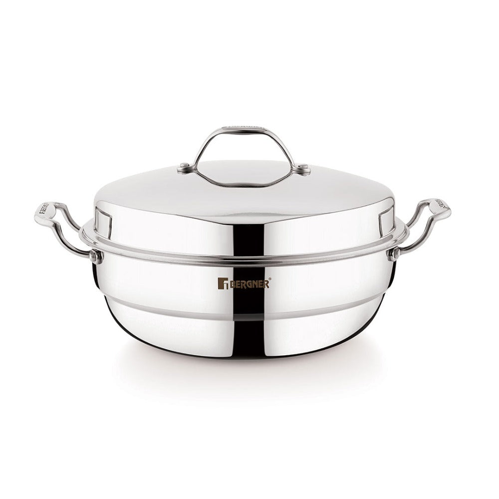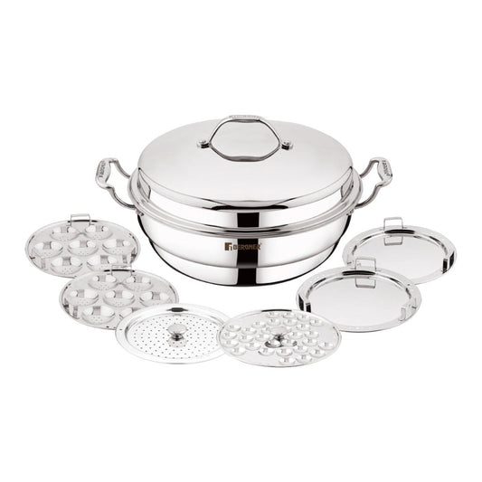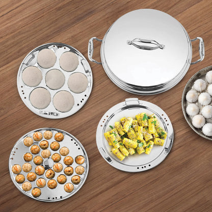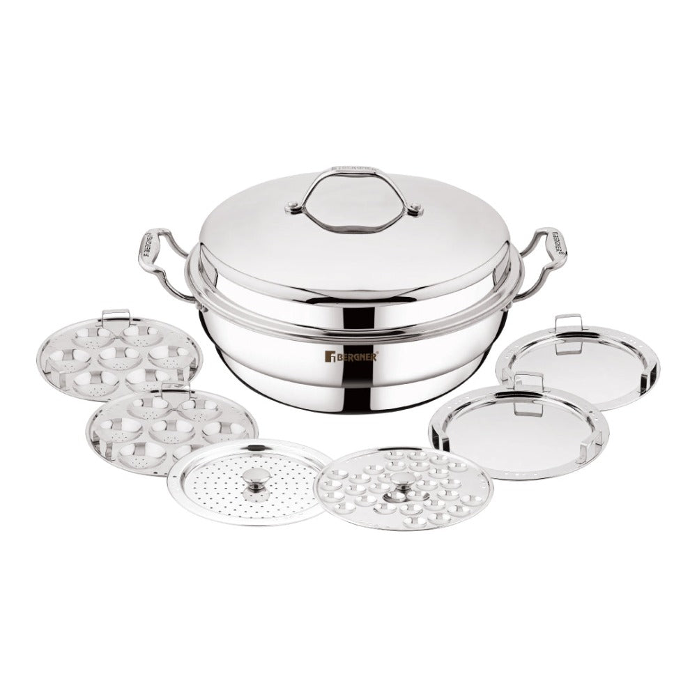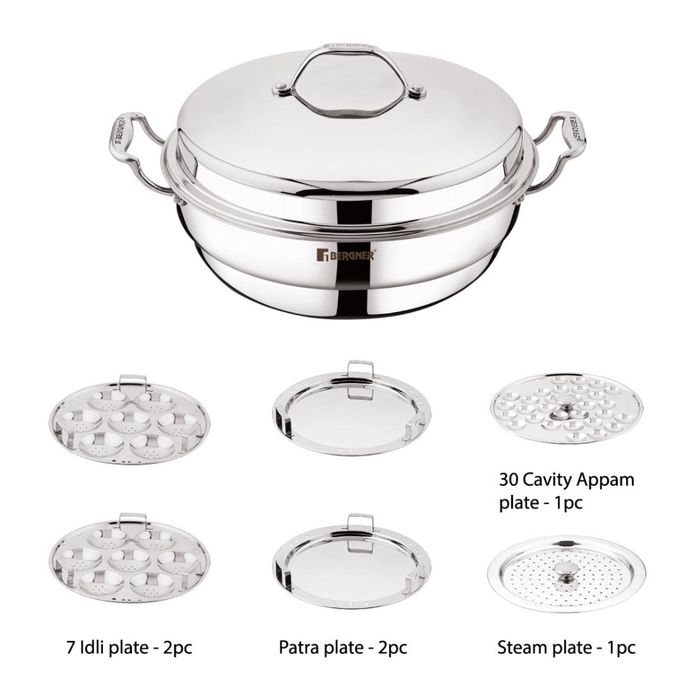 Bergner Argent Tri-Ply Multi Kadai with Lid and 6 Plates | Gas & Induction Compatible | Idli, Dhokla, Patra & Appam Plate