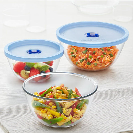 Borosil 2 Bowls with Blue Lid + 1 Bowl without Lid | Transparent | Set of 3 Pcs