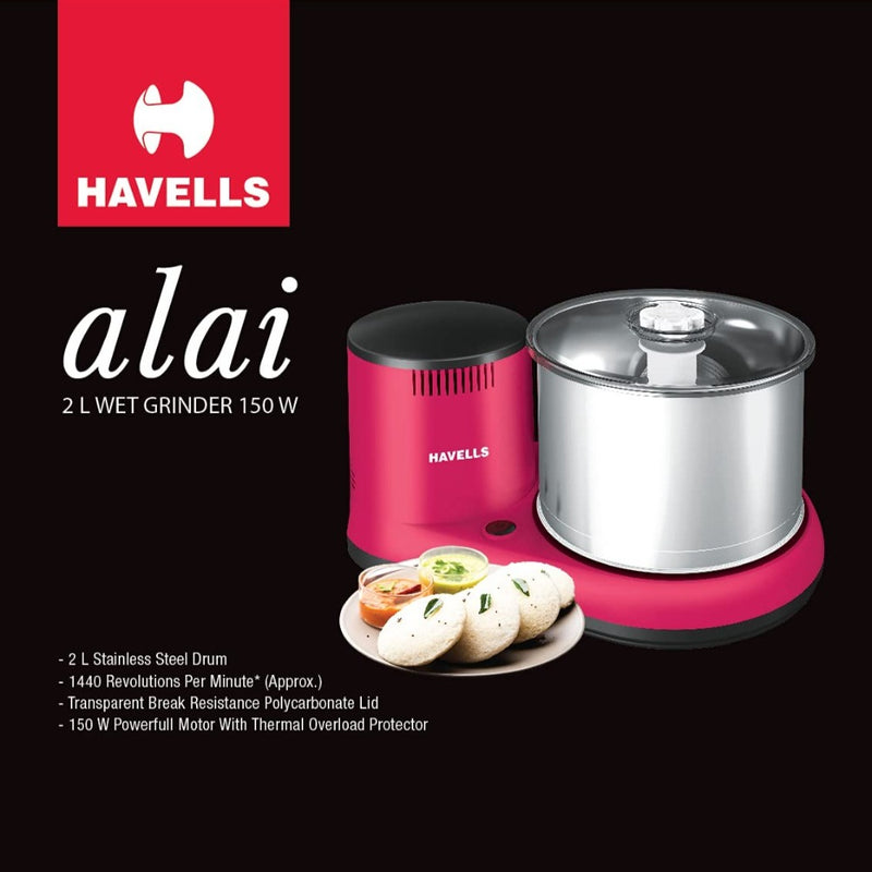 • If you want to get the best wet-grinding experience, then buy Havells Alai 2 Litres 2 Stones Wet Grinder which can be your ultimate choice. Compact and highly efficient, the Havells Alai Wet Grinder will make for a great addition to your kitchen.