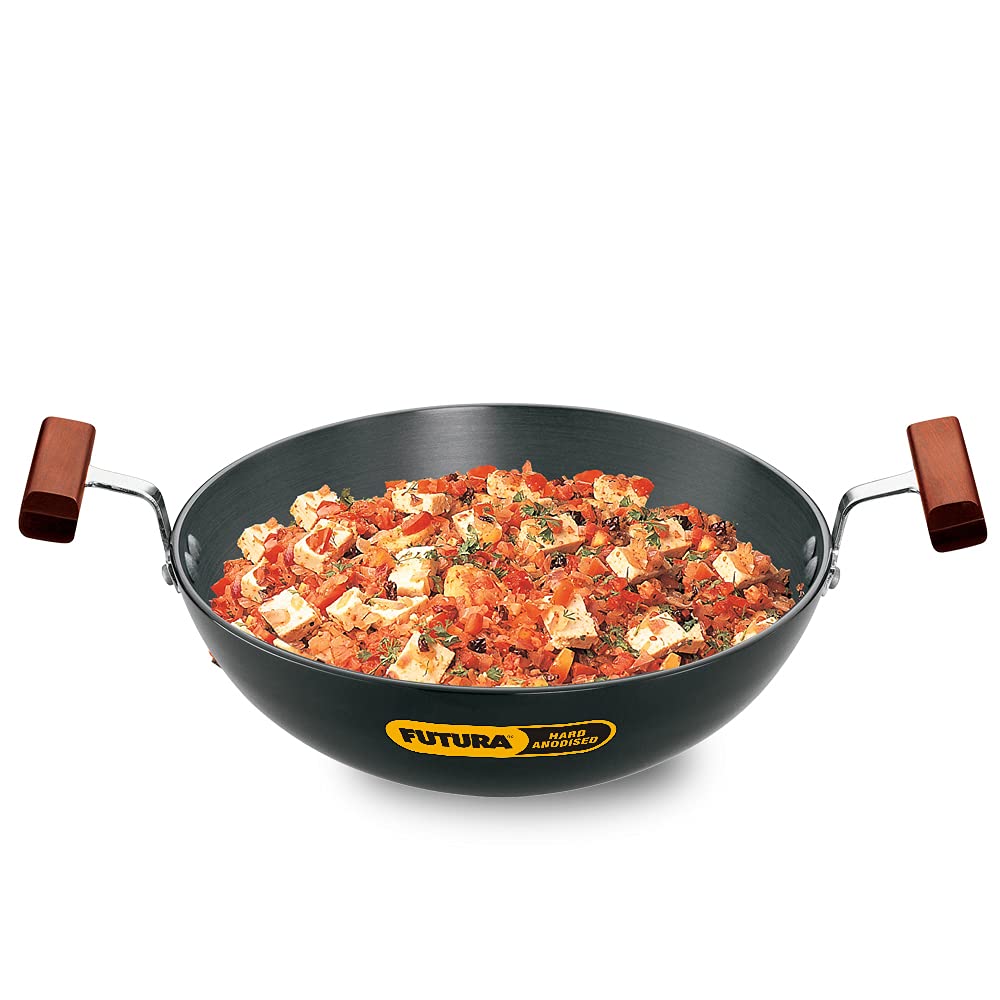 - 4.06 MM EXTRA THICK HEAVY GAUGE: The 4.06 mm extra thick base and sides of the Kadhai (Deep-Fry Pan) spreads heat evenly and retains heat well. The curved sides make it ideal for deep-frying and stir-frying. Food tends to not burn or stick on the hard anodised extra thick base.