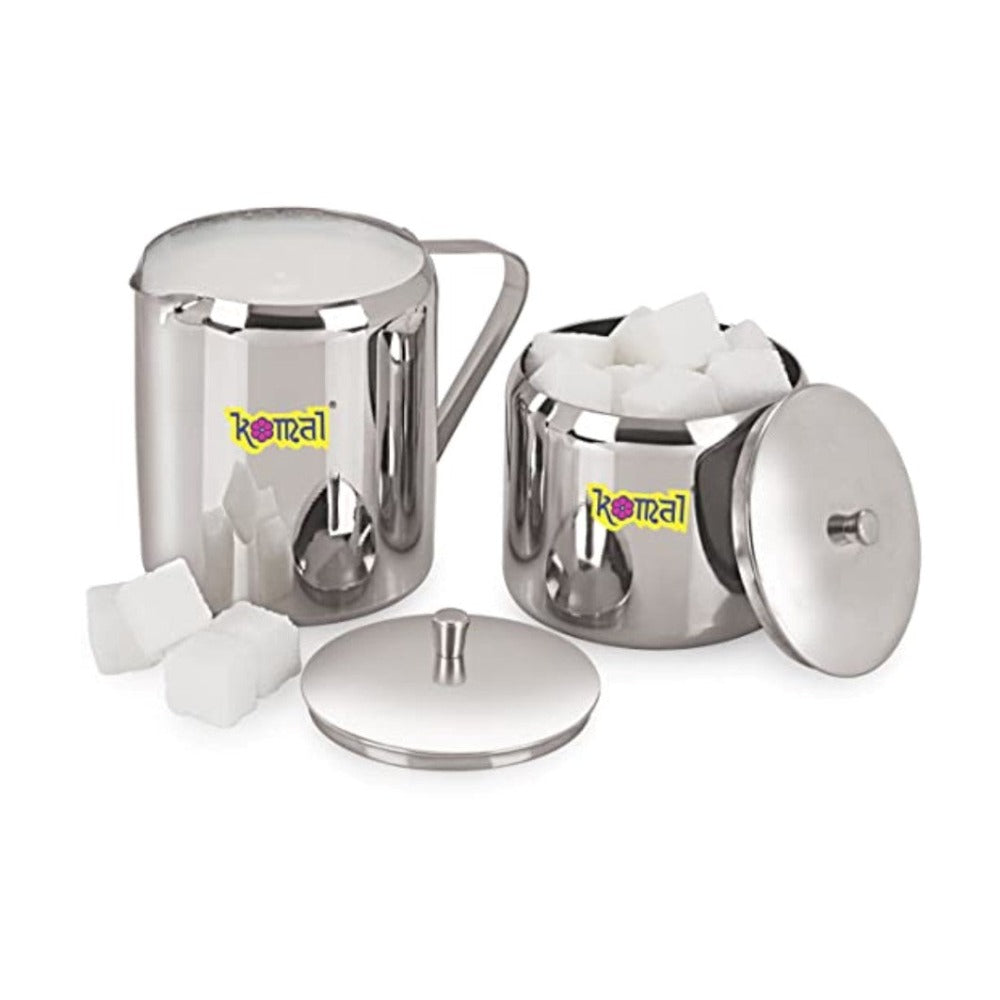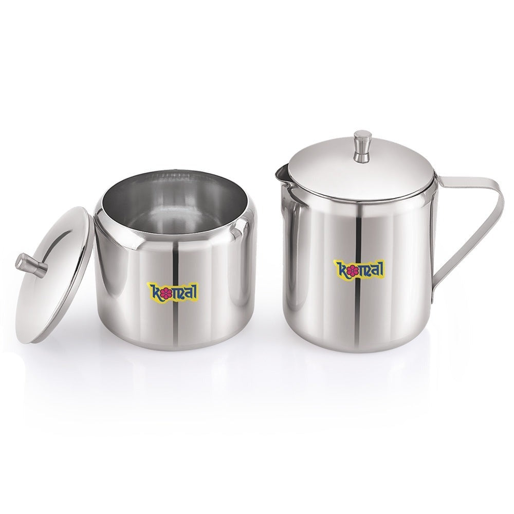 Komal Stainless Steel Big Milk & Sugar Pot Set | Silver Mirror Finish | Dishwasher Safe | Elegant Design | Set of 2 Pcs