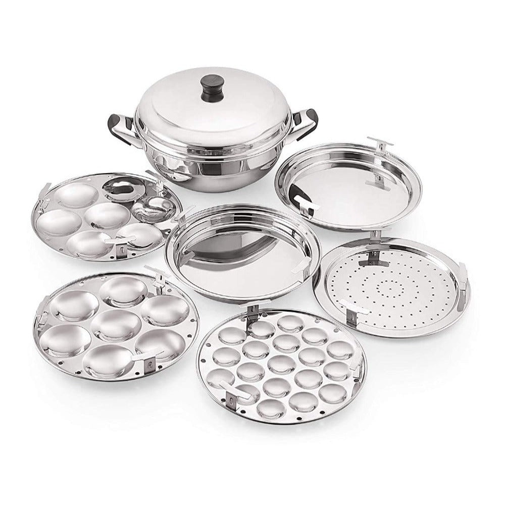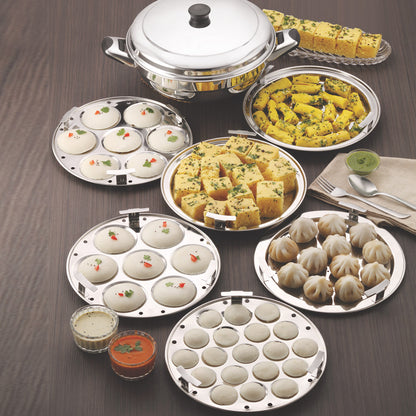 - Package Contents: 1 - Kadhai, 1 - Steamer Plate, 1 - Mini Idli Plate (19 Cavities), 2 - Idli Plates, 2 - Dhokla plates.