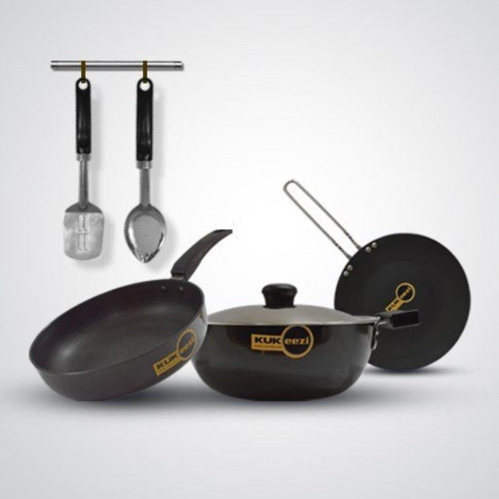 - The set includes Fry Pan, Deep Kadhai, Tawa, and 2 - Piece Cooking tools, making it perfect for all your cooking needs.