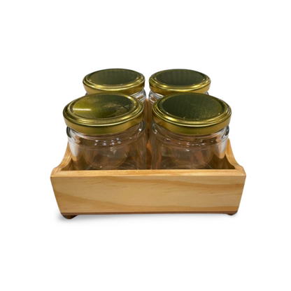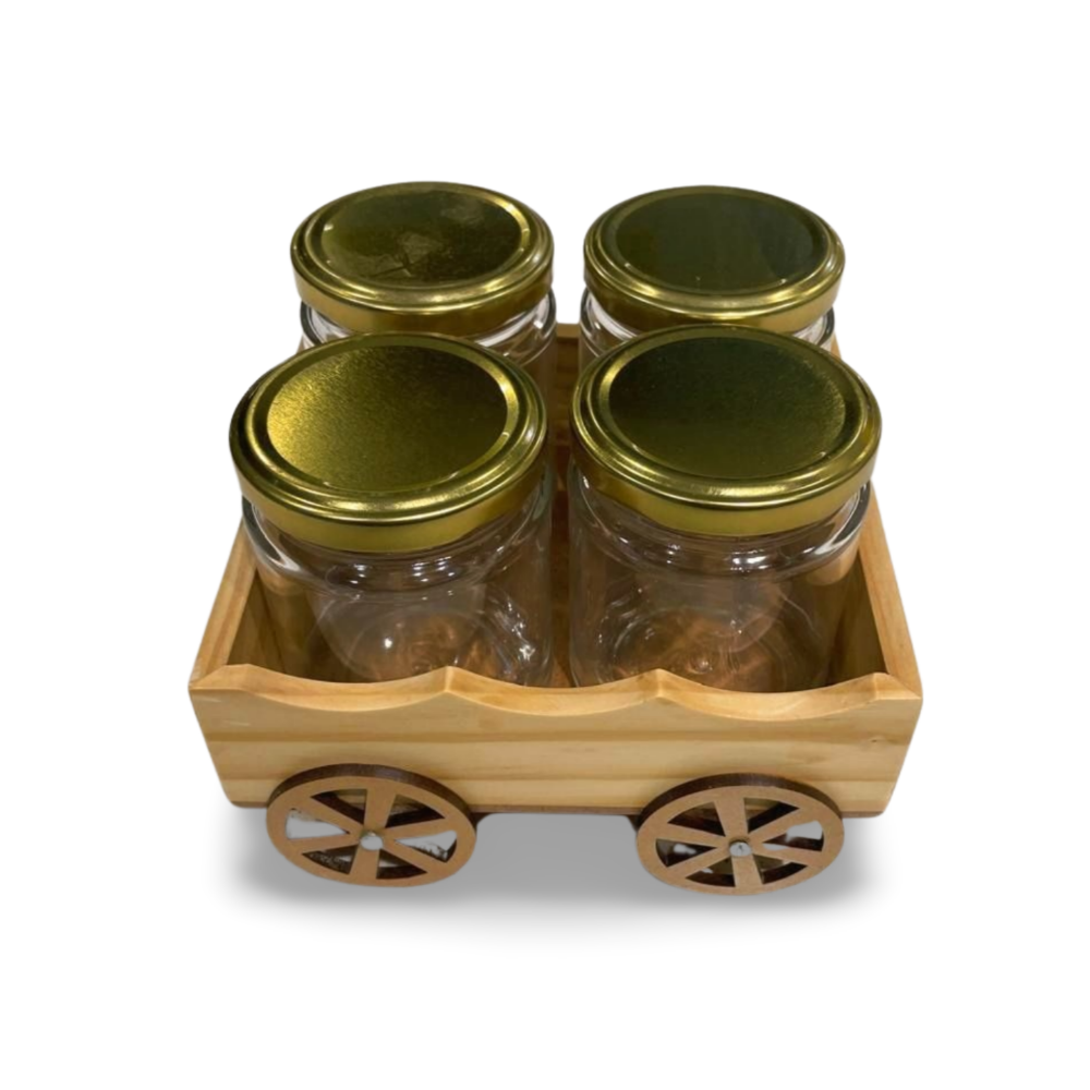 GLASS JARS: Included with the cart are four clear glass jars. These jars come with metallic gold screw-on lids, making them ideal for storing condiments, spices, or other kitchen essentials.