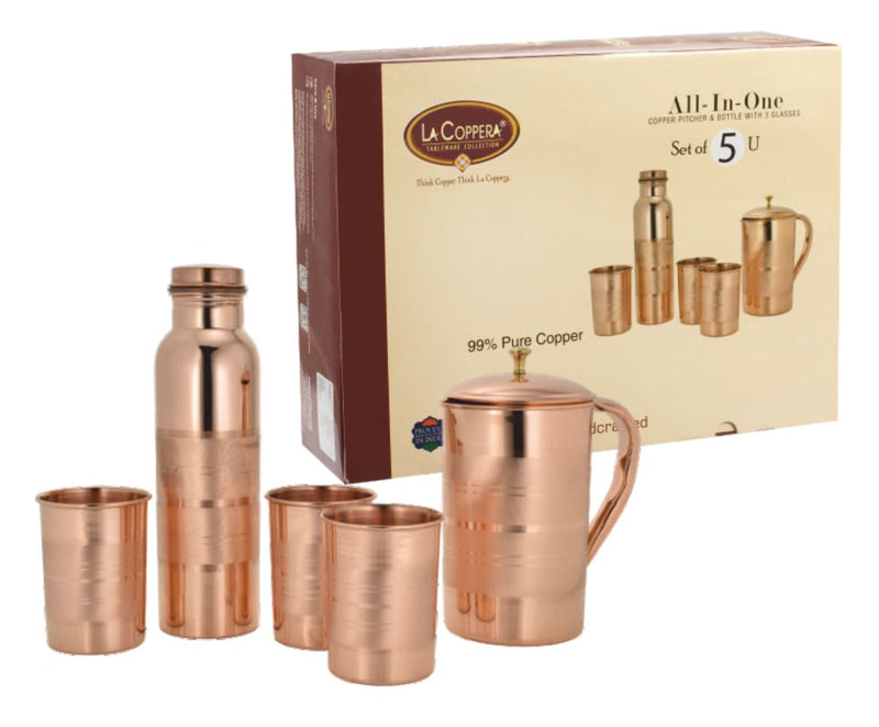 LaCoppera All in One Copper Pitcher & Bottle with 3 Glasses LC537 - La010 | Set of 5 Pcs