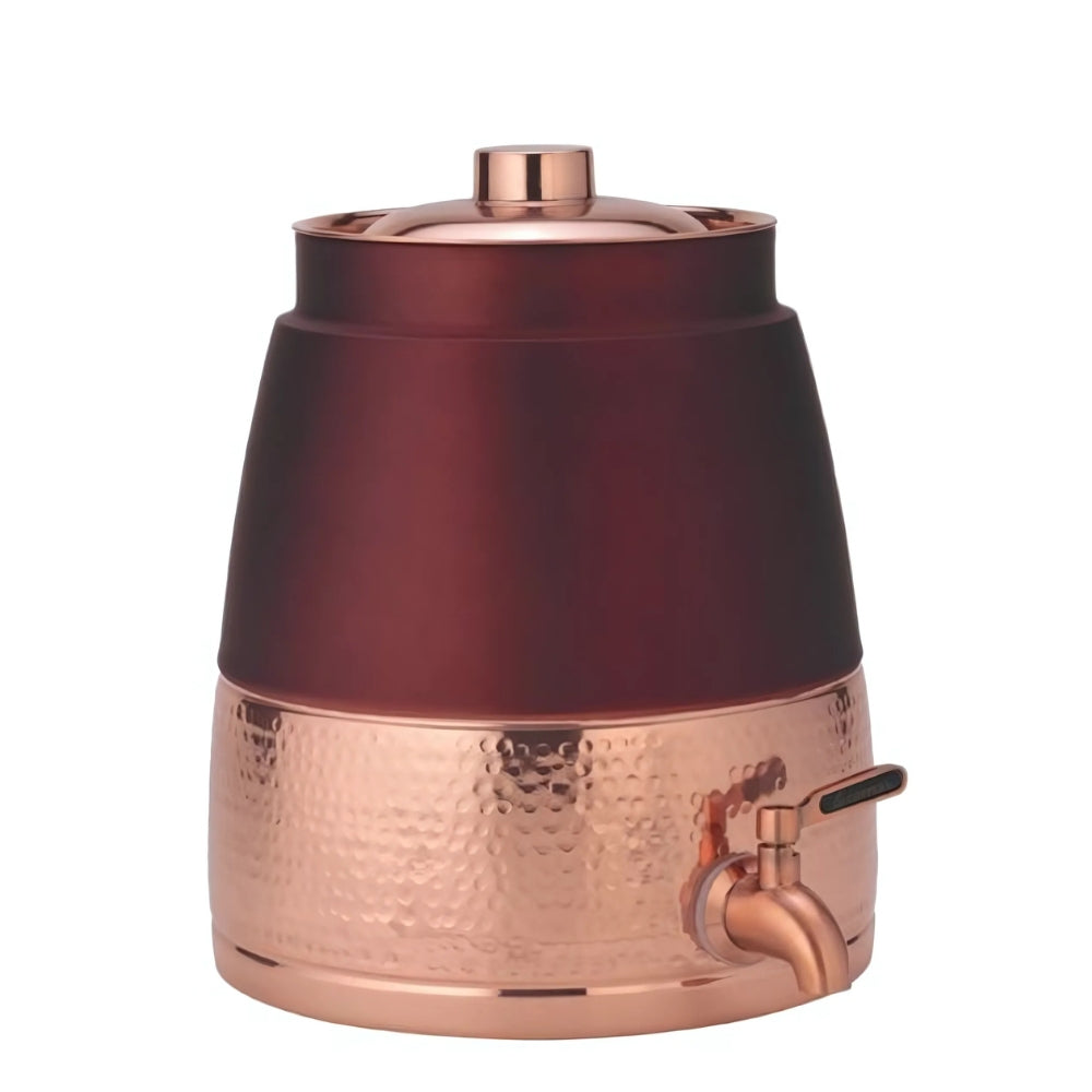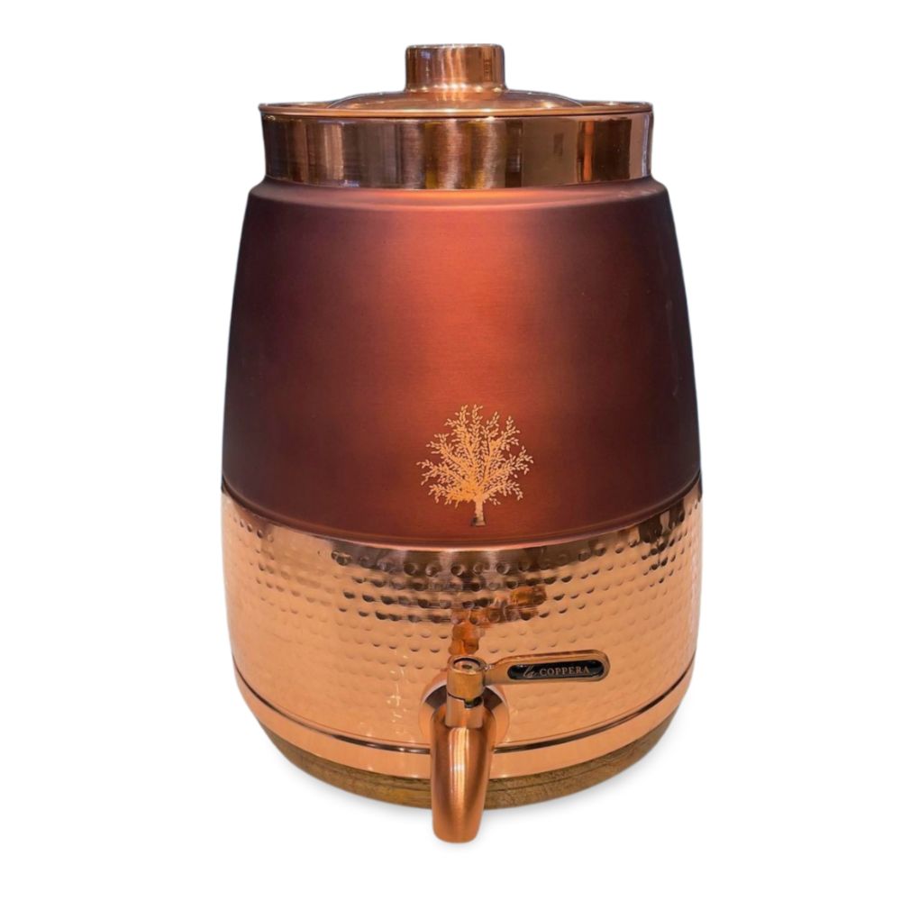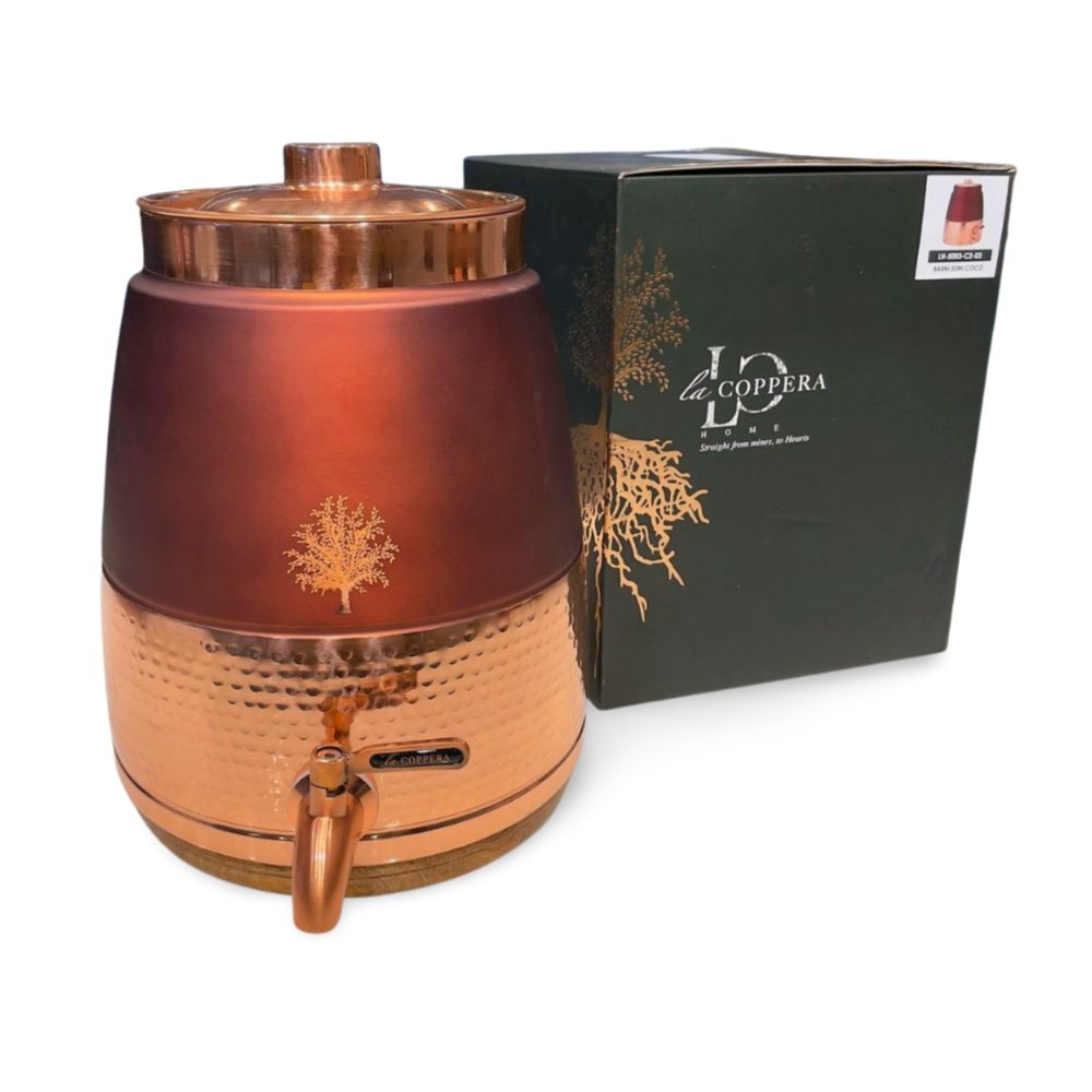 - Elevate your hydration experience with the LaCoppera Barni Semi Coco, a premium water dispenser crafted from pure copper. This exquisite piece features a blend of smooth and hammered textures, adorned with an elegant tree emblem. Its cylindrical shape, topped with a secure lid and a copper spout, combines functionality with traditional charm. Perfect for adding a touch of sophistication to your home or office, the LaCoppera Barni Semi Coco not only enhances the taste of water but also offers numerous health benefits associated with copper.