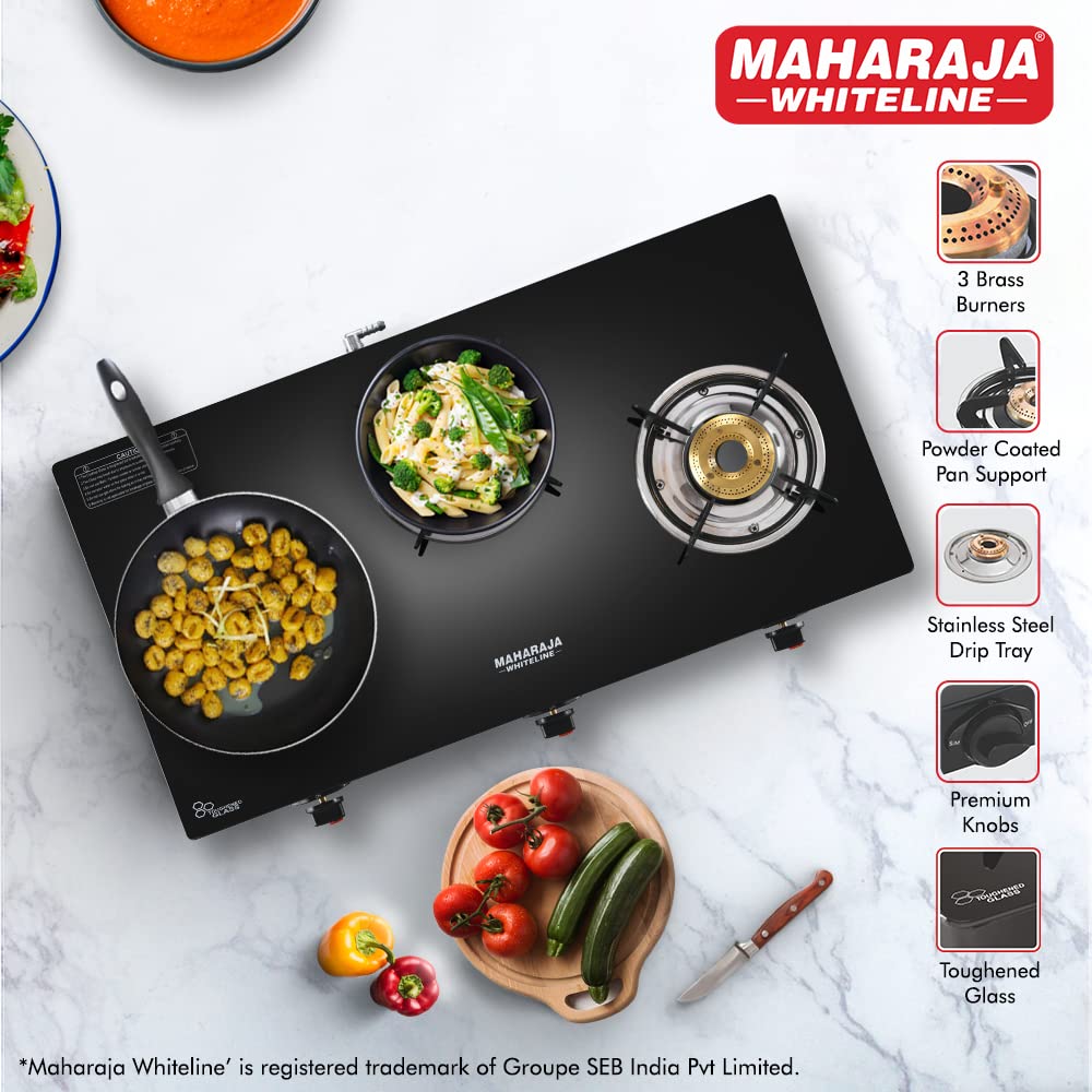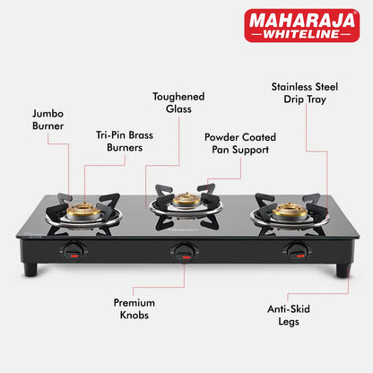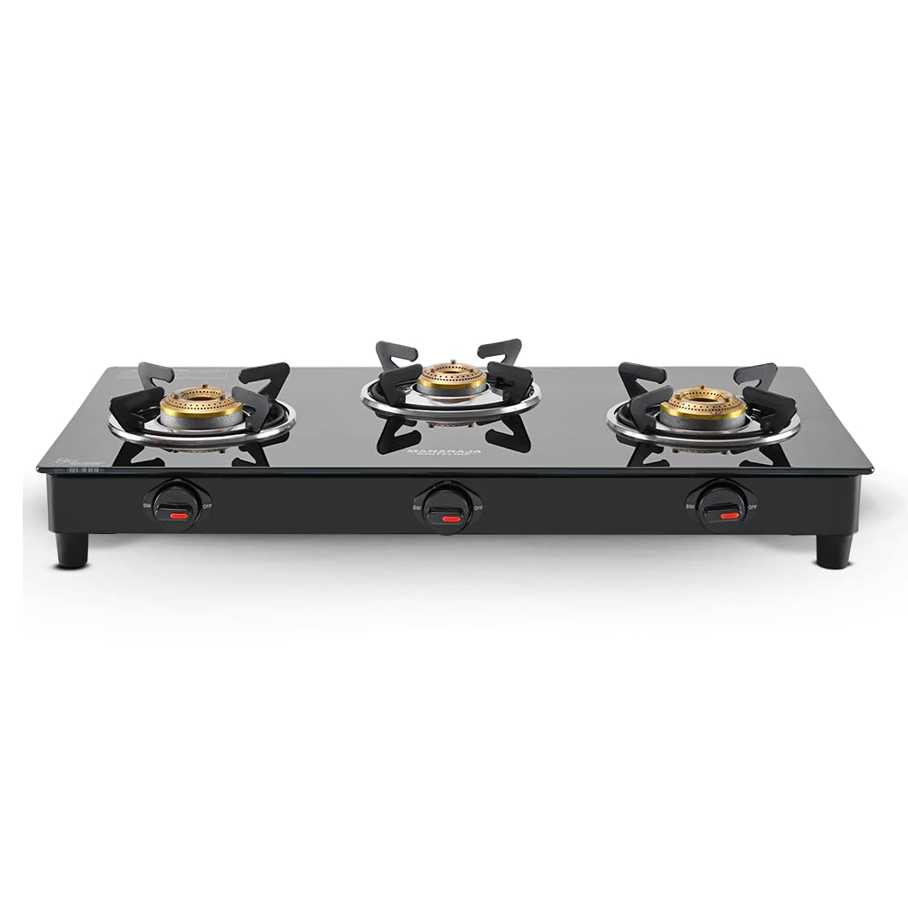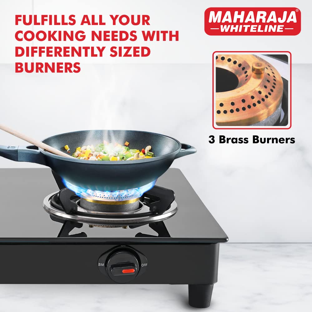 The stove is built with a toughened glass top, brass burners, and powder-coated pan supports for long-lasting use. It comes with a 2-year product warranty and Maharaja also provides 5-year- warranty on the toughened glass, ensuring reliable performance.