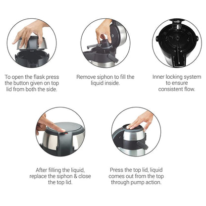 To make your life easier on the move, this leakage-resistant flask comes with a pump dispensing mechanism- You just need to press the top lid to pour. The convenient nozzle of the functional lid does away with the need to painstakingly pour the liquid whenever you need to refresh yourself.