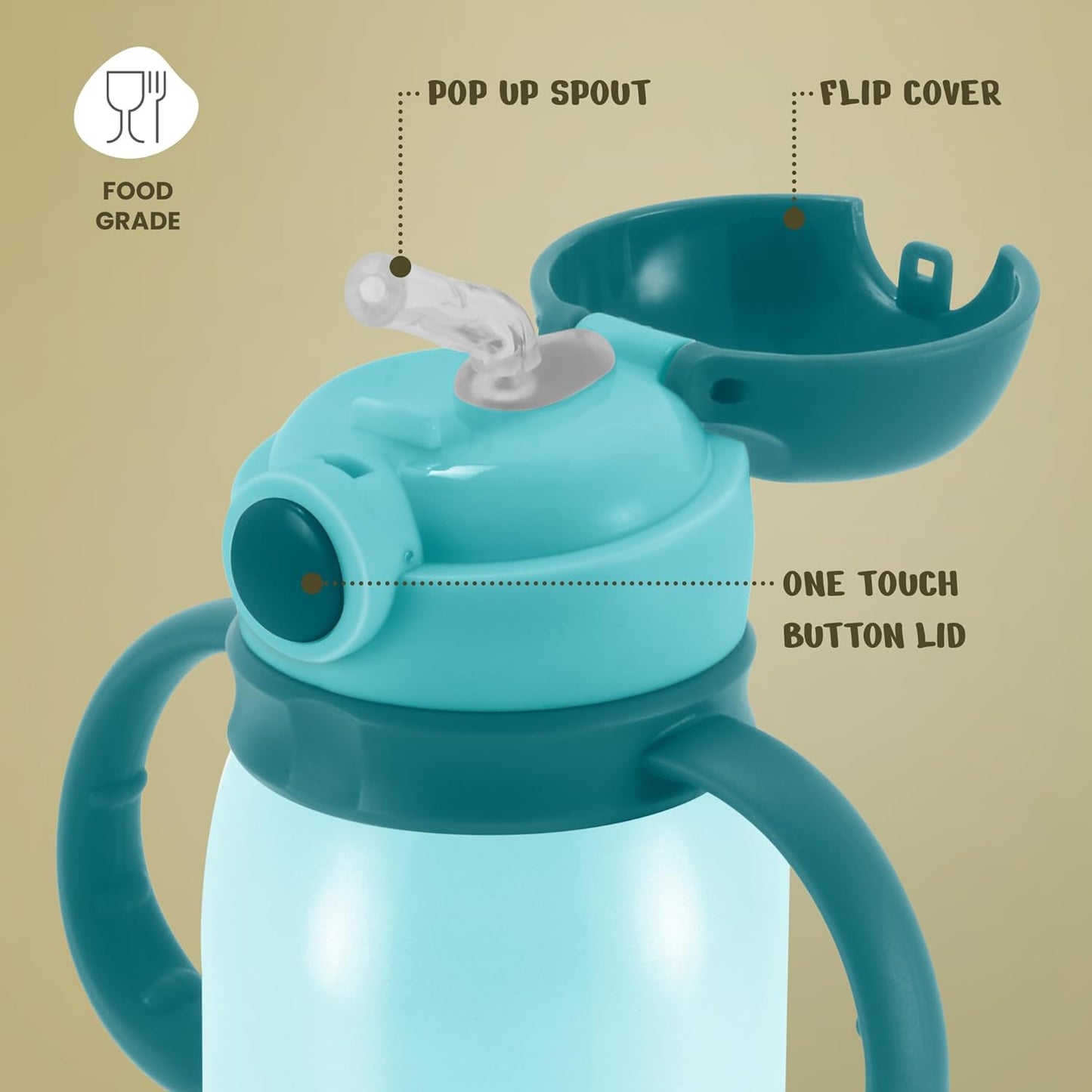 - Vacuum insulated bottle with Pop up Spout is made up of a durable SS 304 inside and Outside, built to withstand the demands of everyday use.