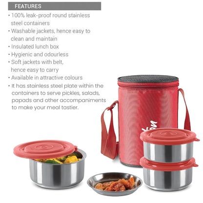 - Featuring leak-proof stainless steel containers with a jacket so that you can carry a variety of food without the fear of spillage.