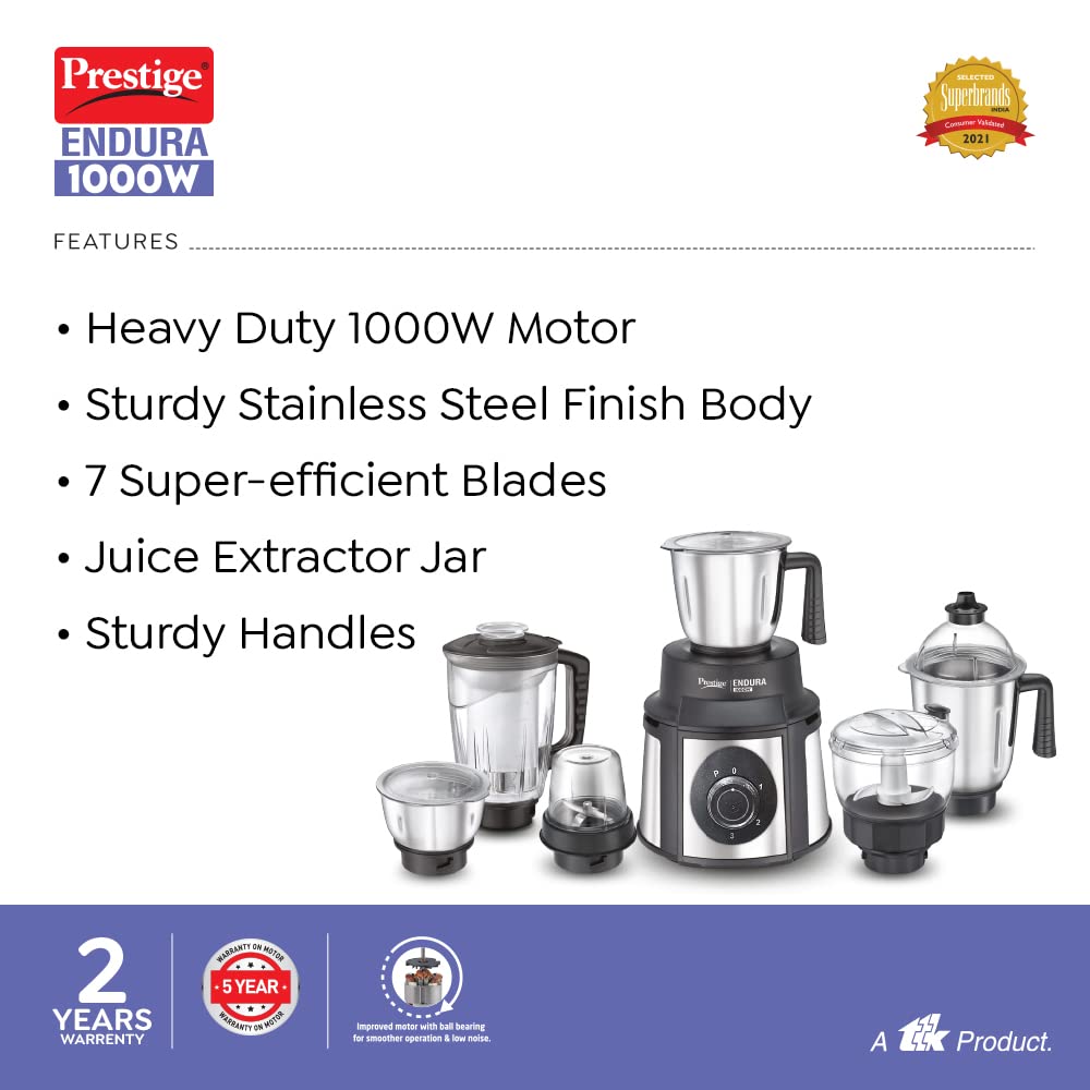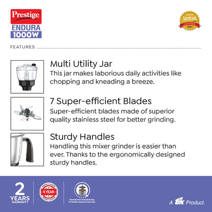 • Presenting Endura from Prestige, the new sturdy mixer-grinder no kitchen can do without. This black & steel work-of-art couple model-like good looks with superior performance, doing it all!