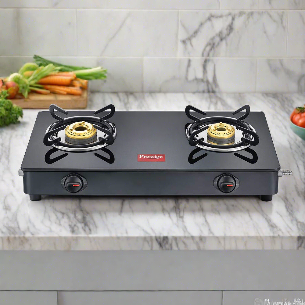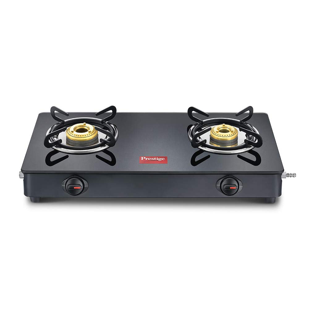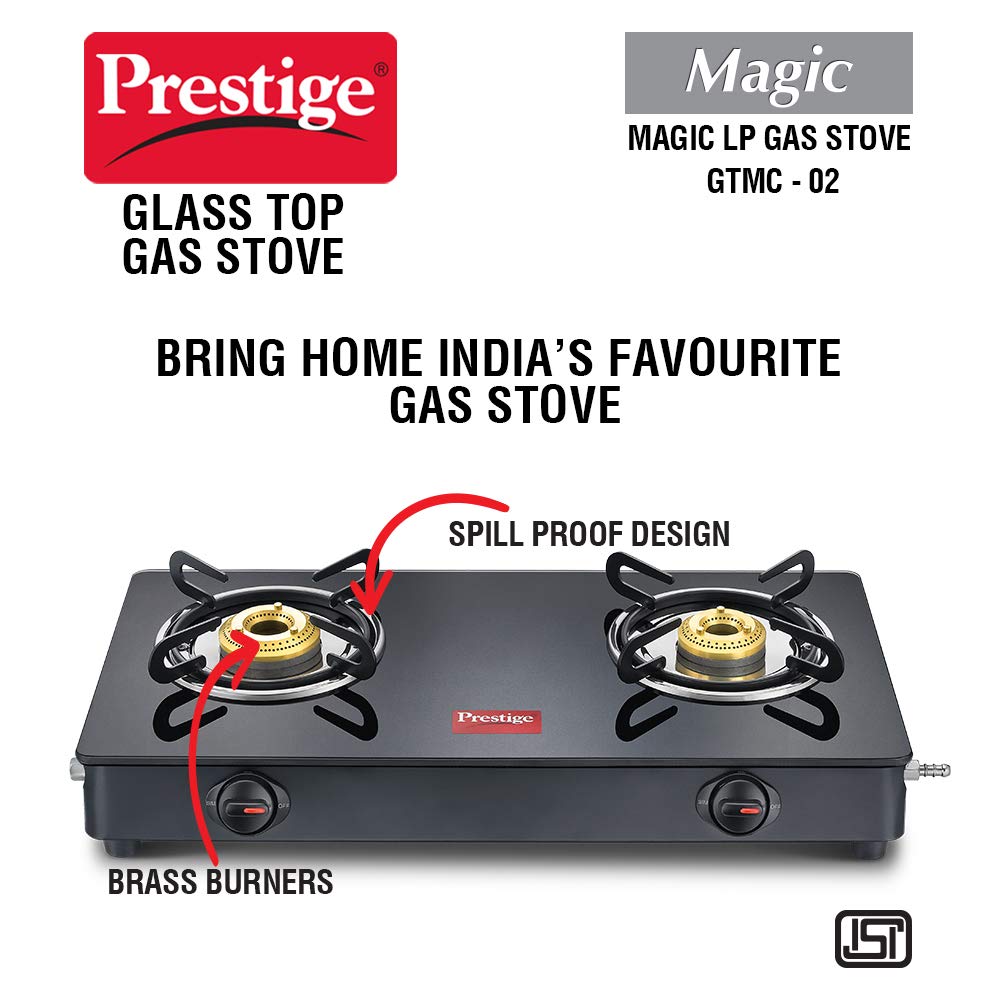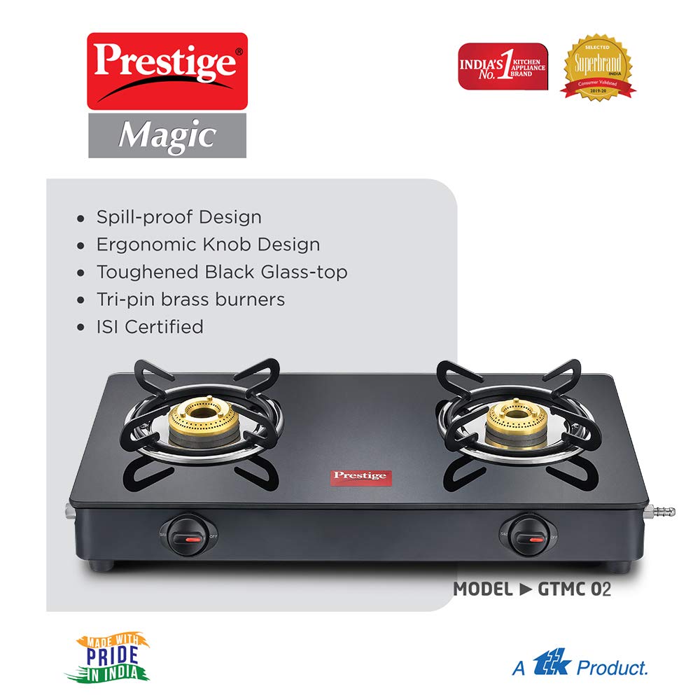 Prestige Magic Glass Top 2 Burner Gas Stove, Manual Ignition, Black