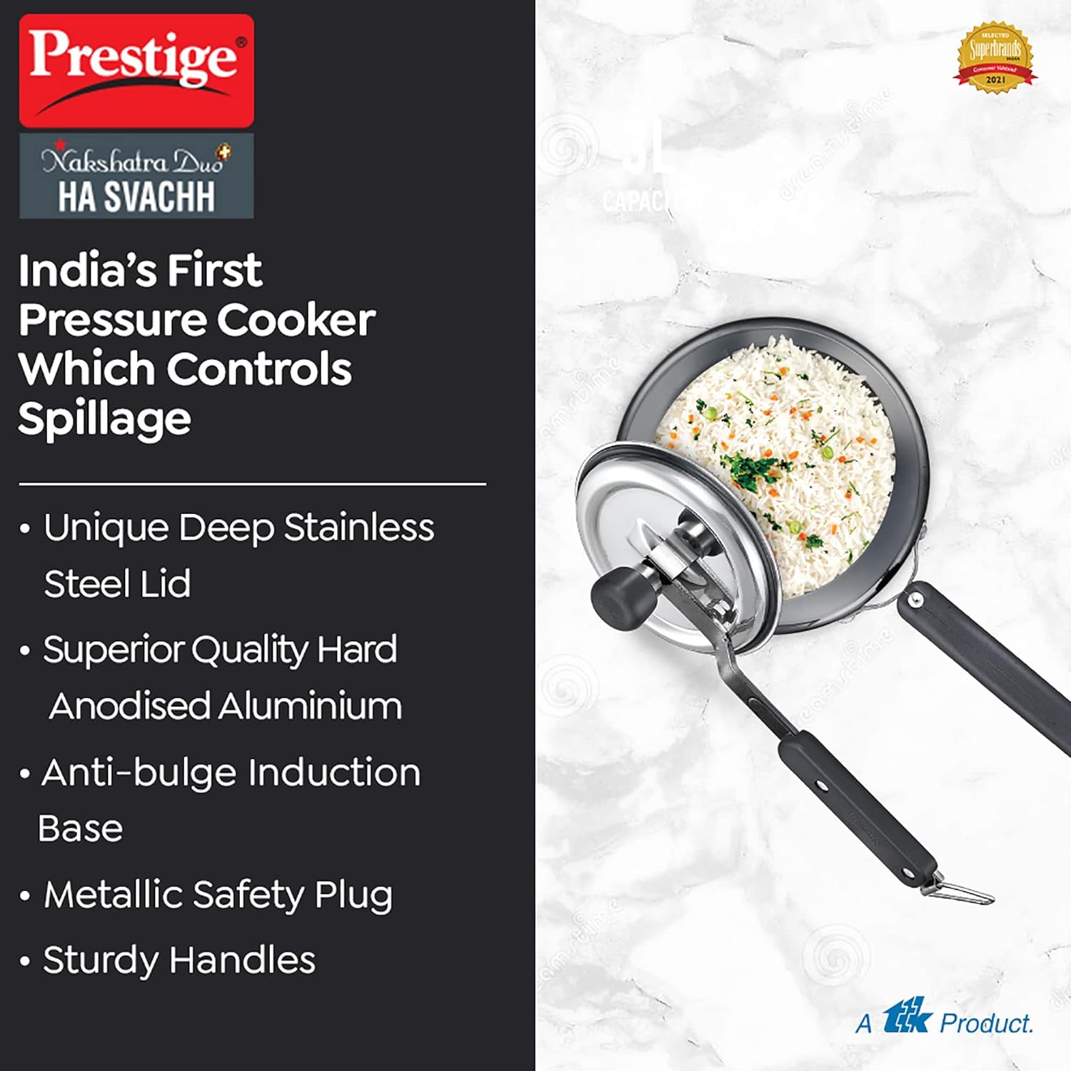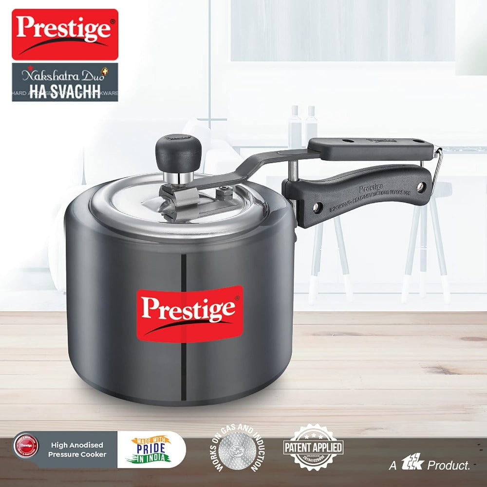 - Prestige Nakshatra Duo Plus Svachh Hard Anodised Aluminium Pressure Cooker is carefully designed to give you delicious meals in the smartest way.