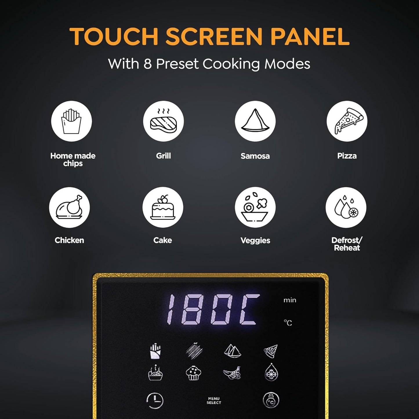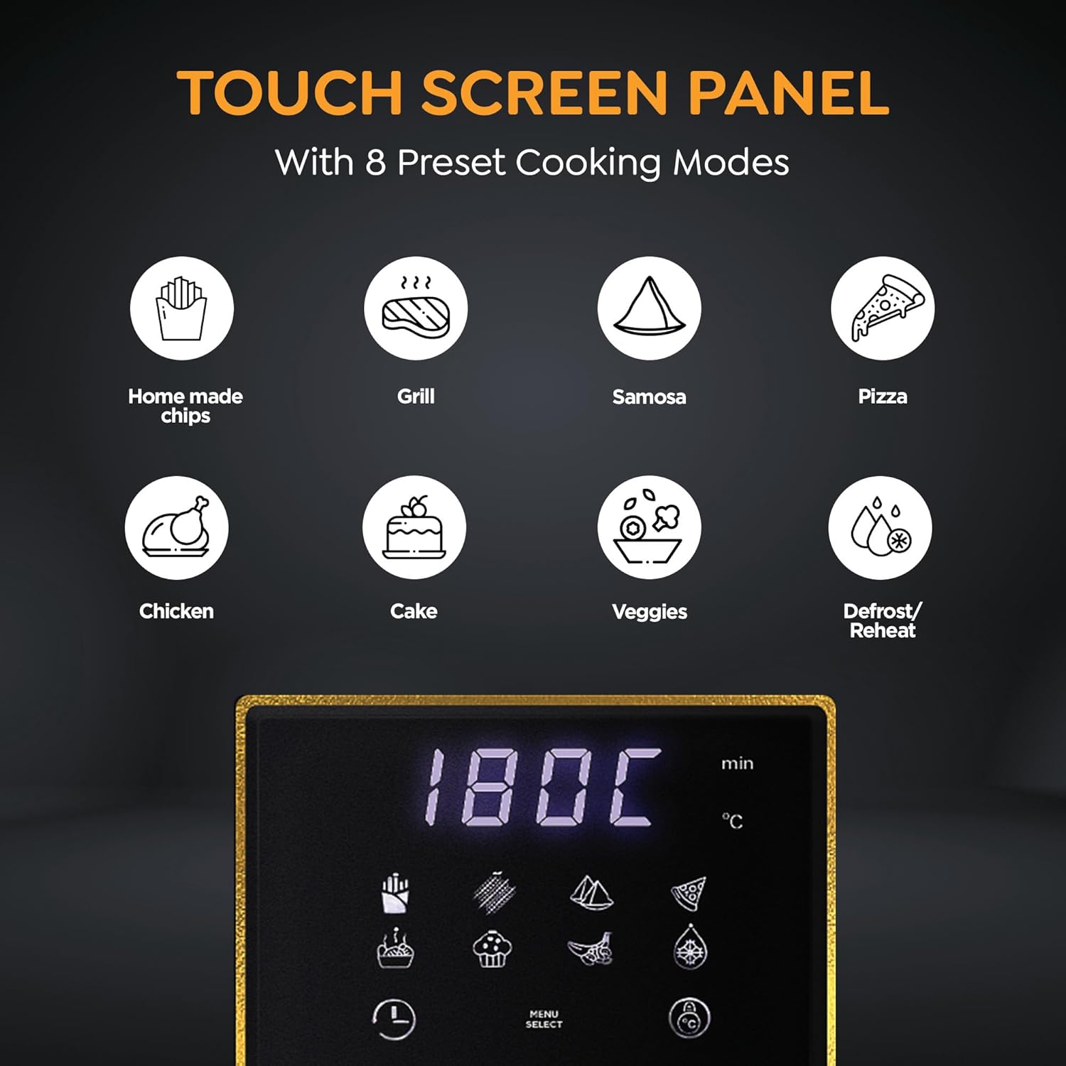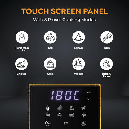 - Introducing 8-Preset Cooking Modes: Home made chips, Grill, Samosa, Pizza, Cake, Veggies, Defrost/Reheat, Chicken.
