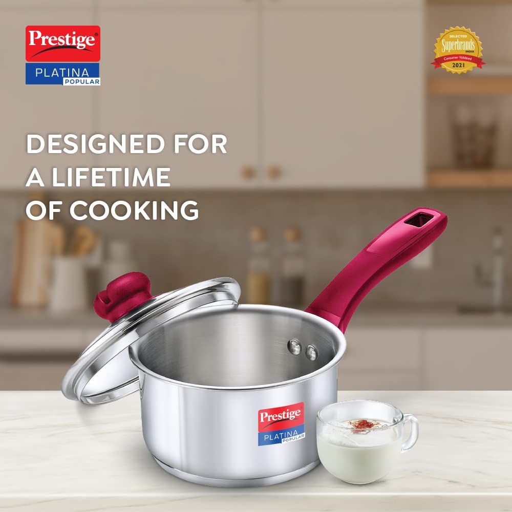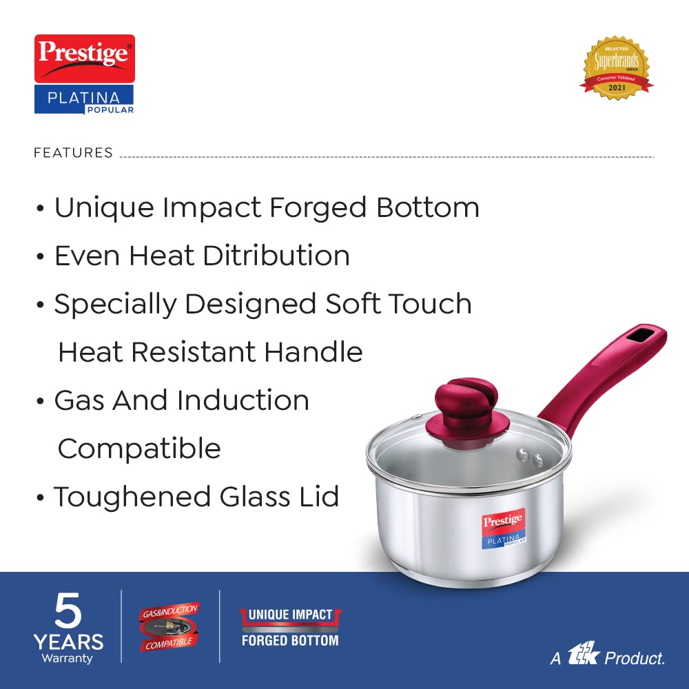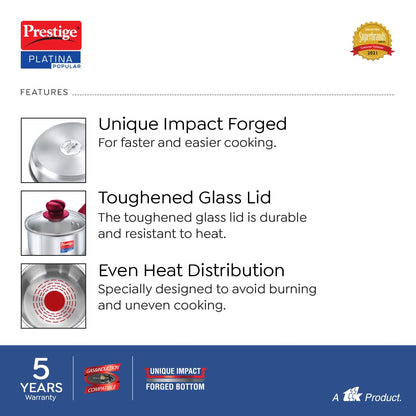 - Right from its design to its functionality, the all-new Prestige Platina Popular cookware undeniably makes a statement of style and utility in your kitchen. Crafted with perfection, this range of cookware comes with a host of features such as unique forged bottom and even a heat distribution mechanism.