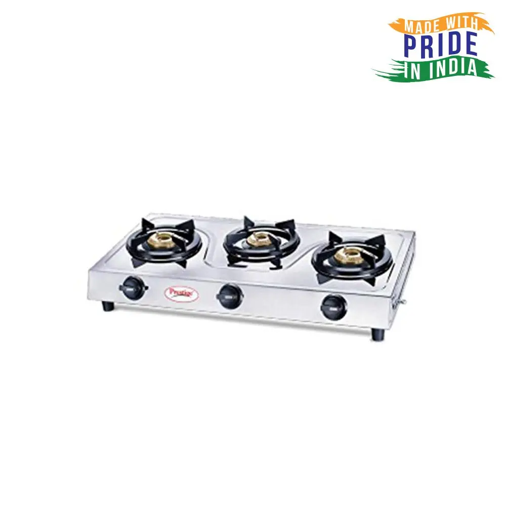 • Package Contents: 1 Prestige Prime Three Burner Gas Stove, 3 Burners, 3 Pan Support, 1 User Manual with Warranty Card