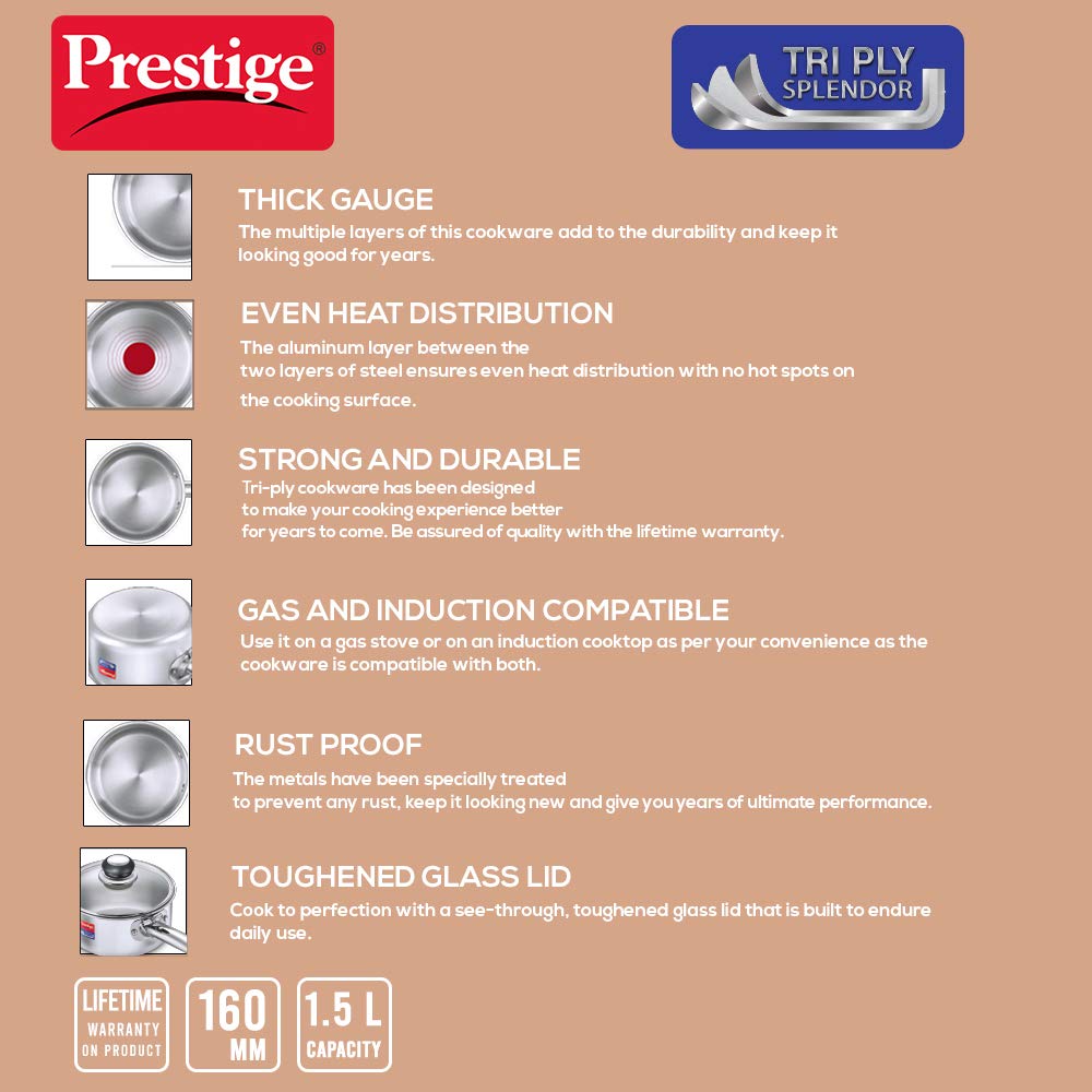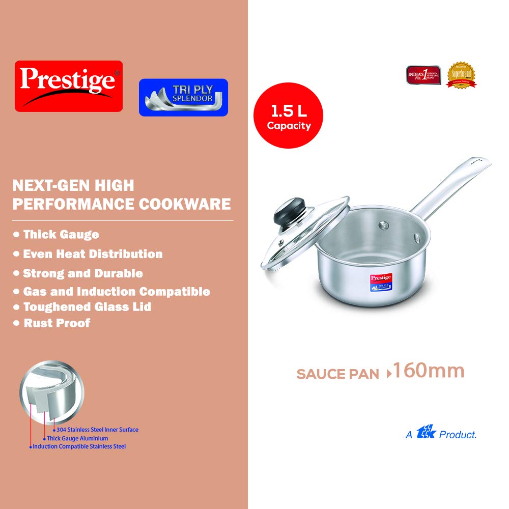 - Package Contents: 1 Piece Prestige Stainless Steel Tri-Ply Splendor Sauce Pan with Glass Lid, 1 User Manual with Warranty Card