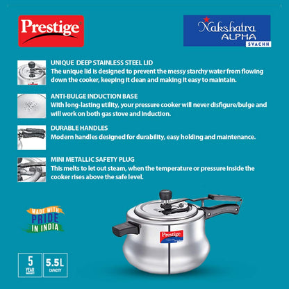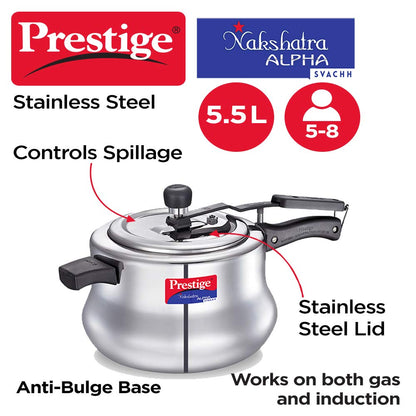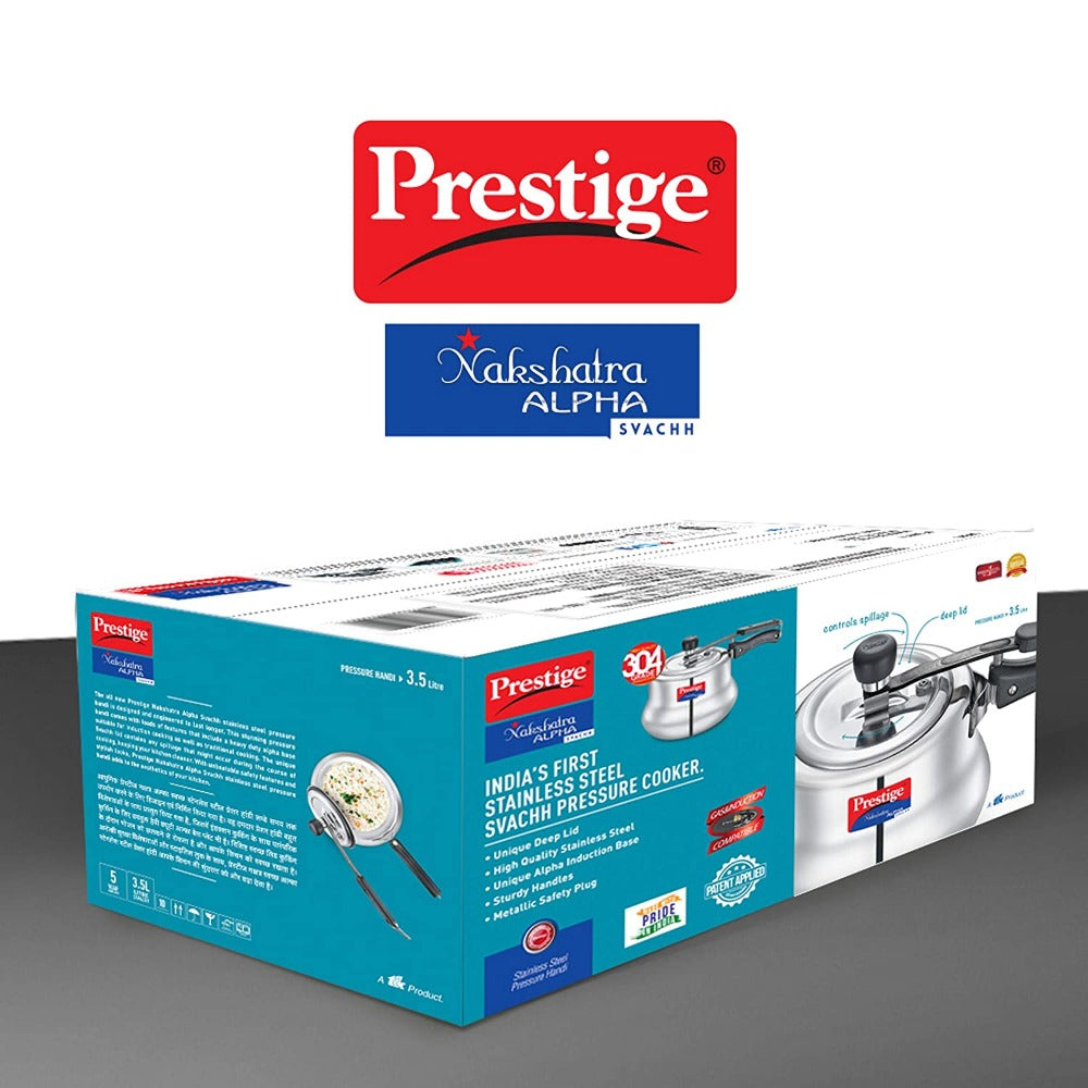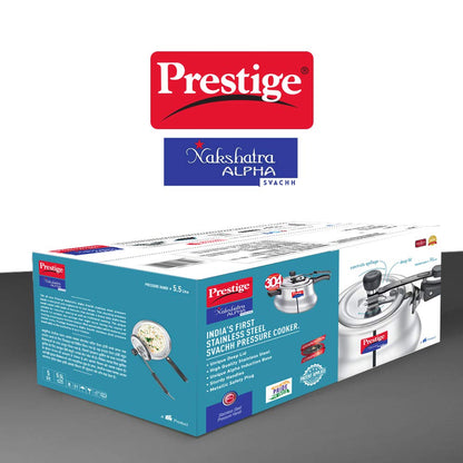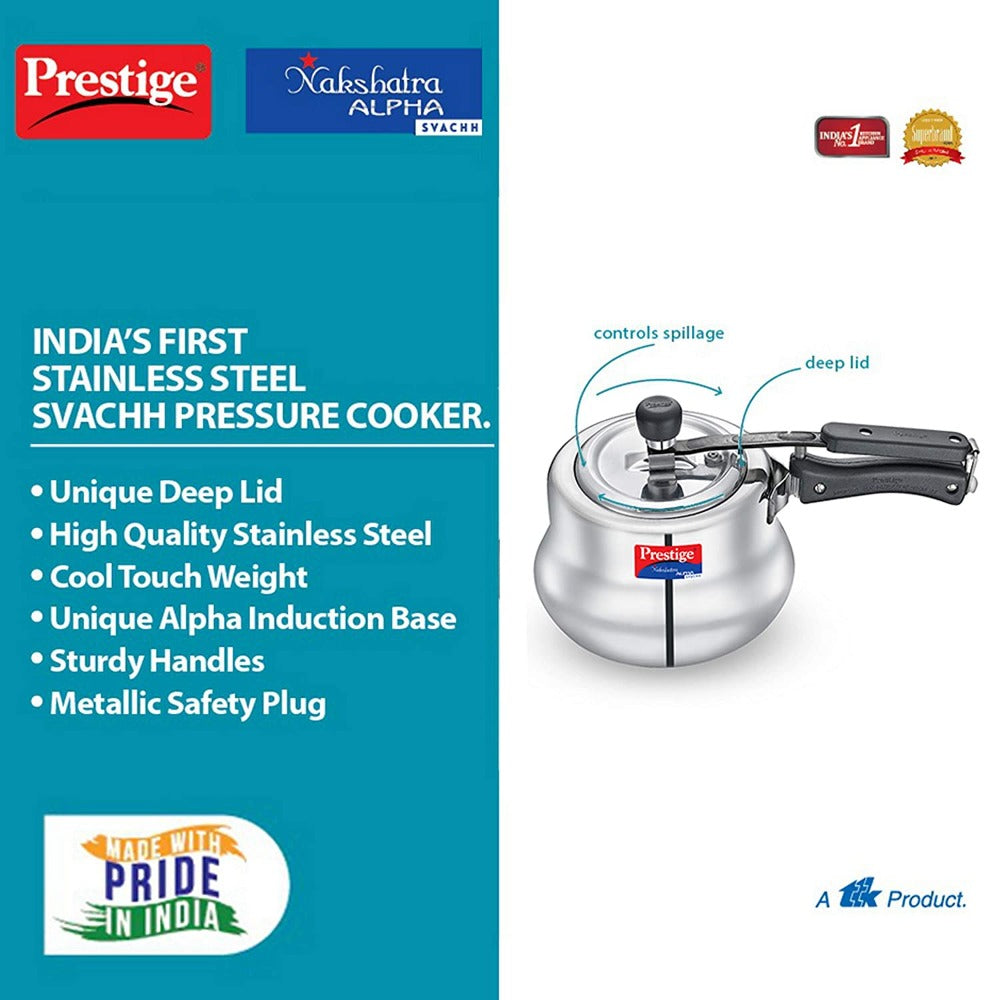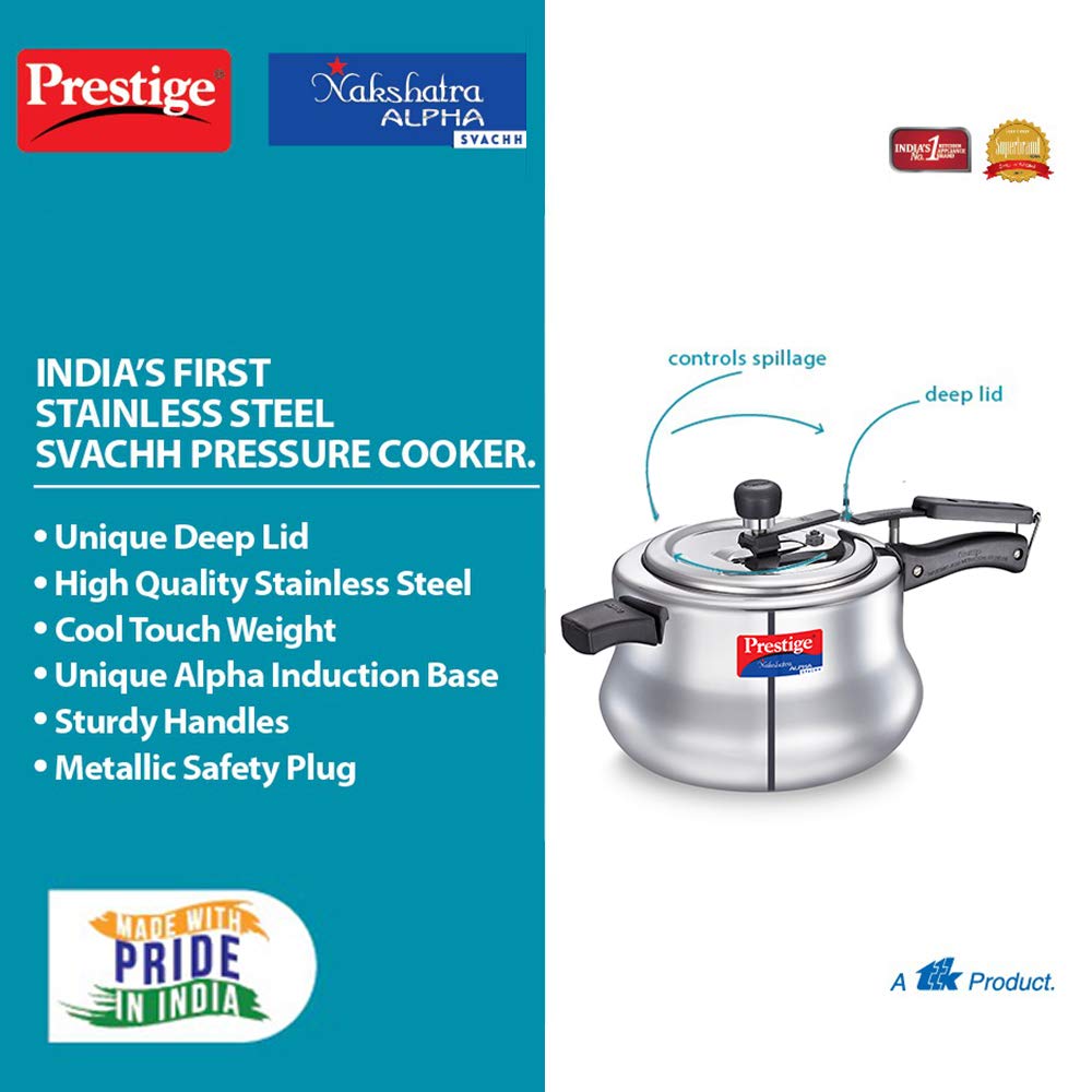 - The all-new Prestige Nakshatra Alpha Svachh stainless steel pressure cooker is designed and engineered to last longer.