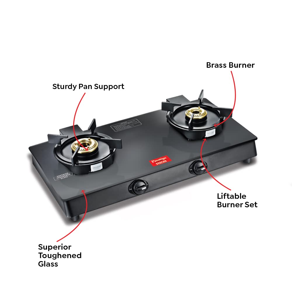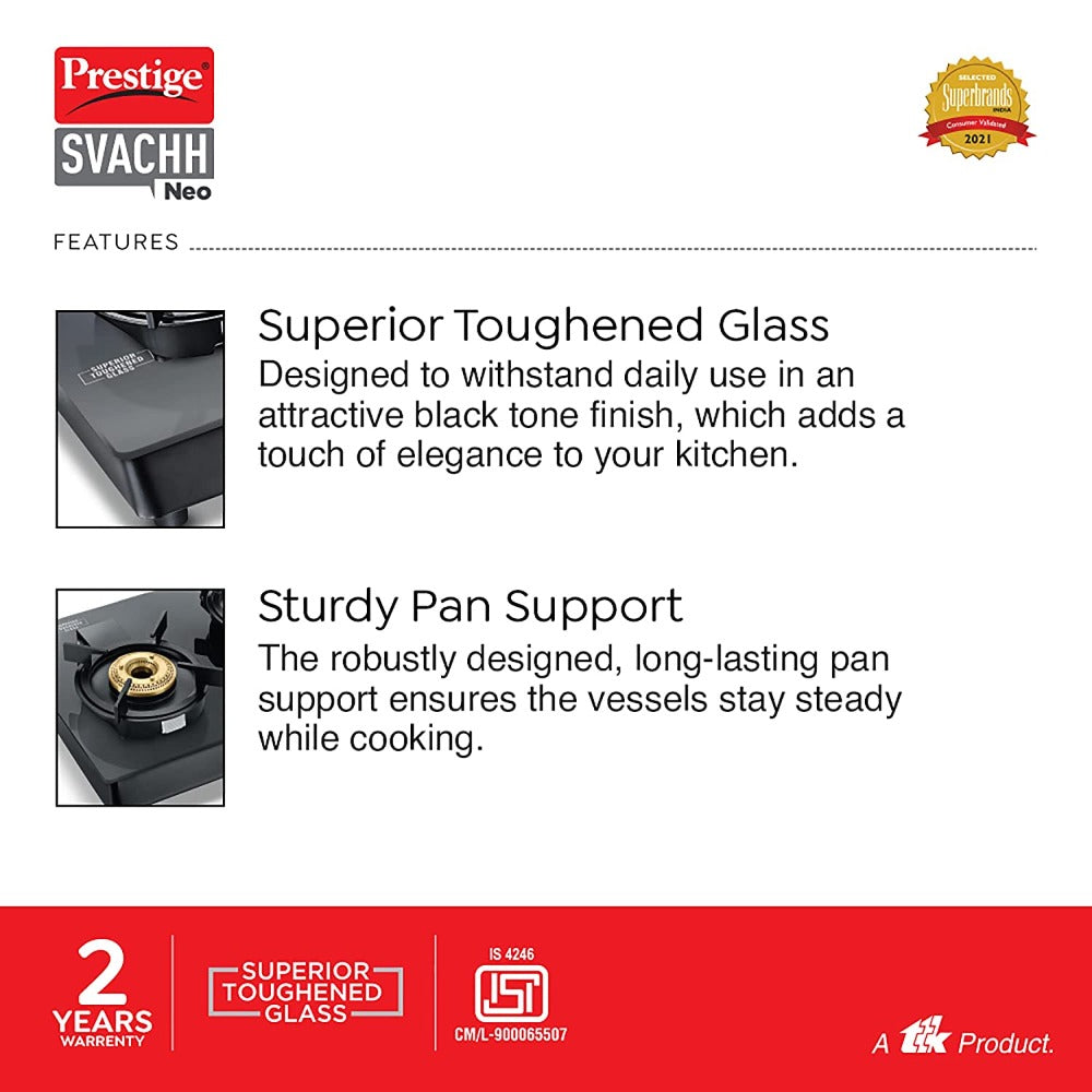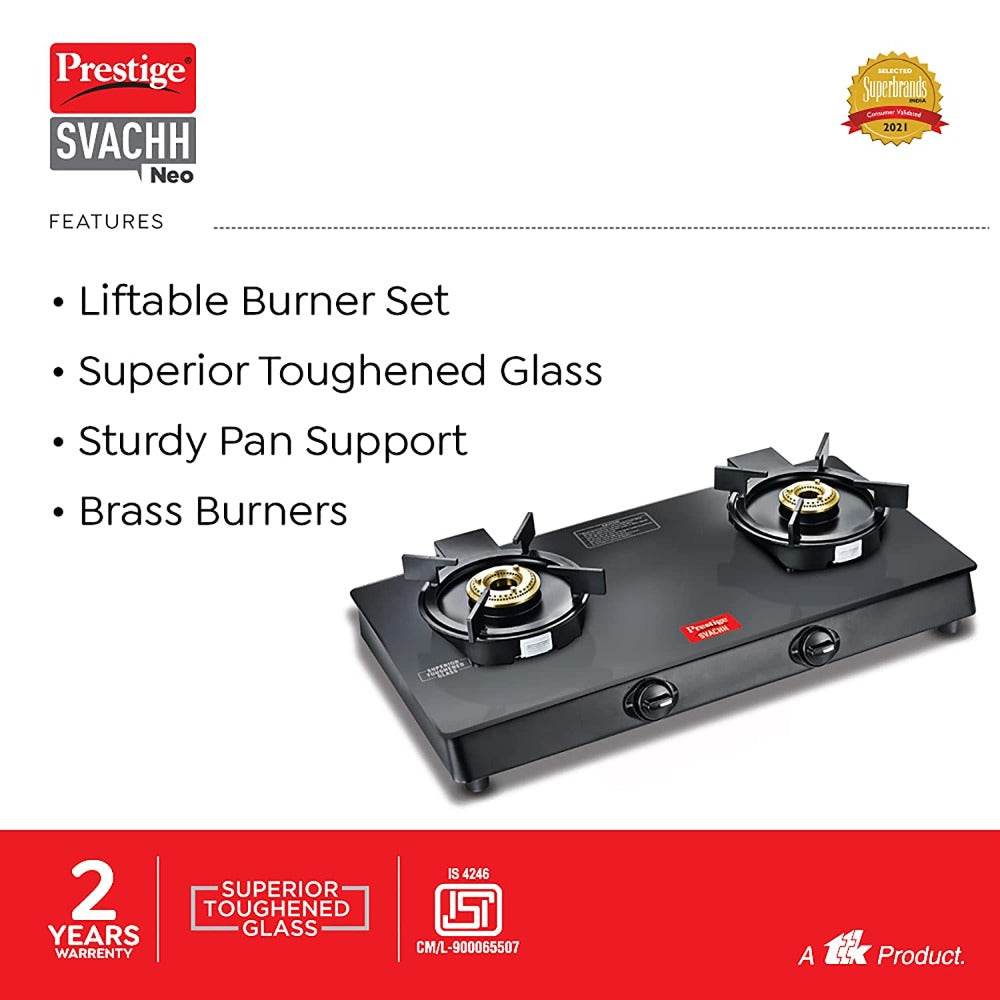 Prestige Svachh Neo Toughened Glass Top Gas Stove with 2 Liftable Burners | Black