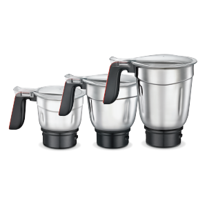 The package includes three durable stainless steel jars: a 1600 ml Wet Jar, a 1300 ml Dry Jar, and a 700 ml Chutney Jar, designed to handle different grinding needs efficiently.
