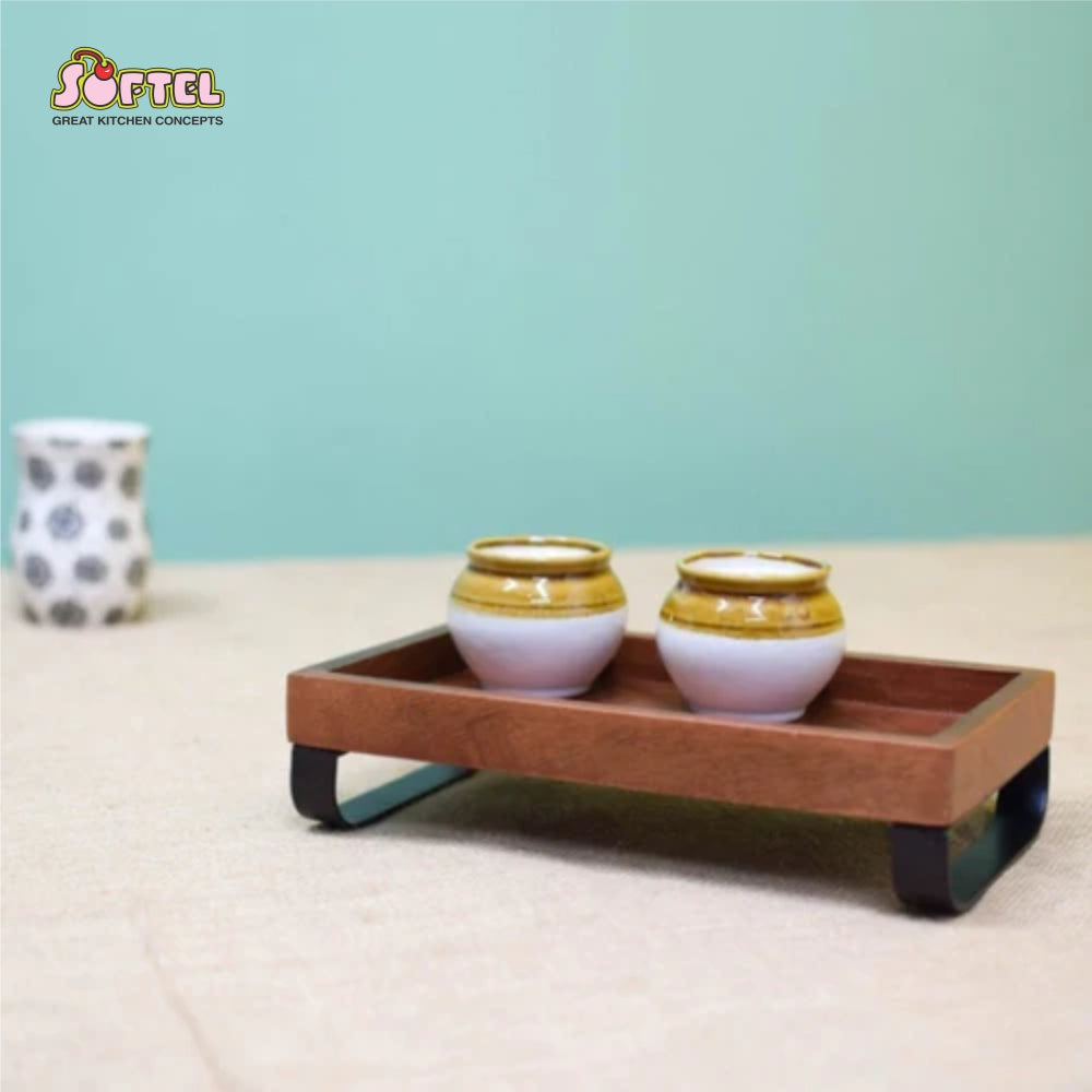 Softel Mahogany Finish Wooden Serving Tray | Handcrafted Mango Wood Tray with Metal Legs | Elegant Appetizer Platter for Snacks and Beverages