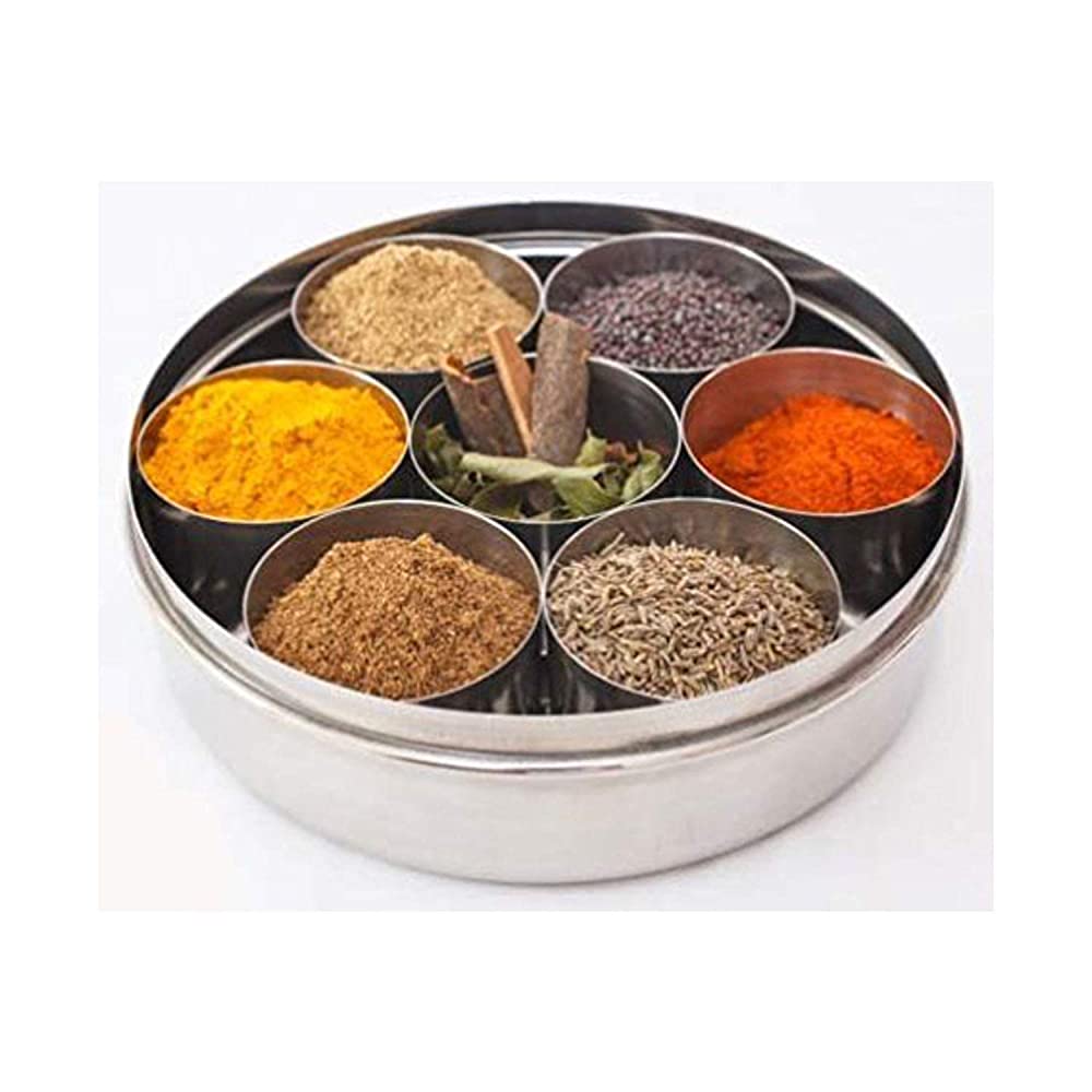 - EASY TO USE: Toral Designer masala Dabba comes with seven separate removable stainless steel Containers, and an inner lid to keep your masala from spilling, 1 small utility spoon for convenient handling and ease of use.