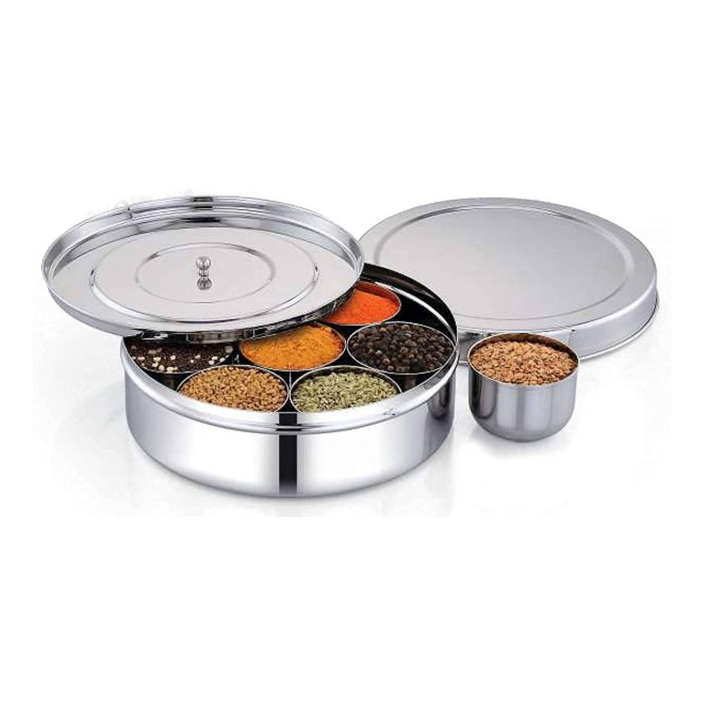- An essential in all Indian kitchens, made of the best quality stainless steel, Toral Stainless Steel Masala Dabba comes with an inner lid to keep your masala from spilling.