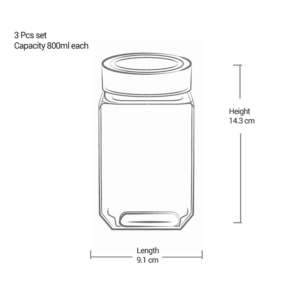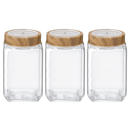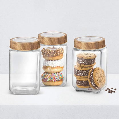 Treo Woody Cube Jar 800 ML Storage Glass Jar | Transparent | Set of 3 Pcs